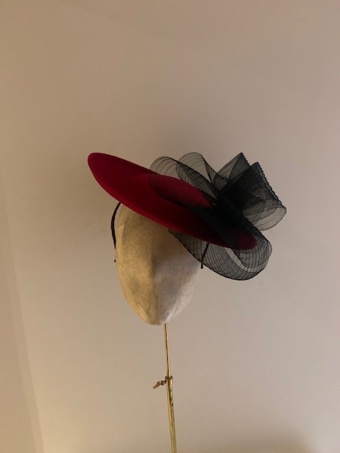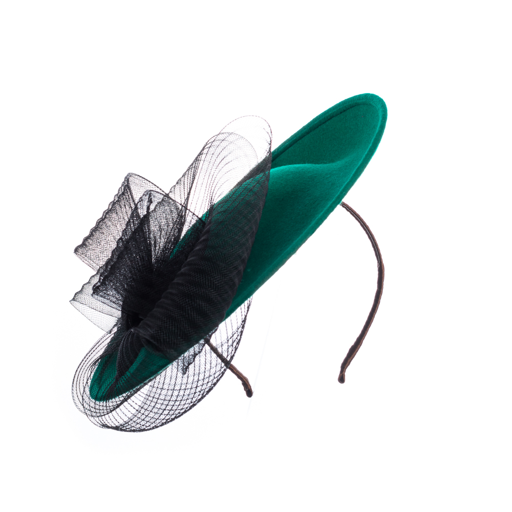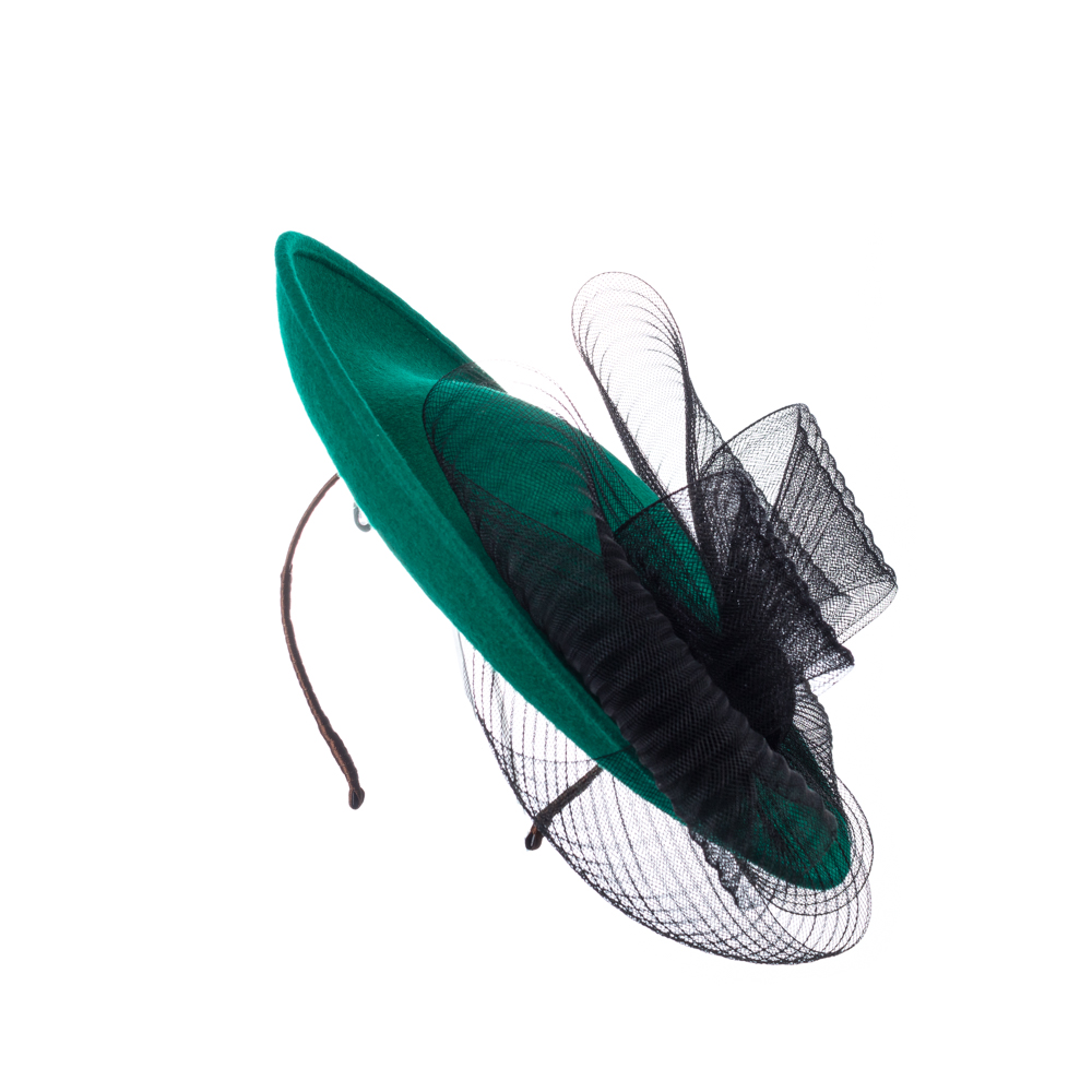 The Raphael Dish Hat comes on a comfortable ribbon wrapped double headband matched to your hair colour.