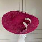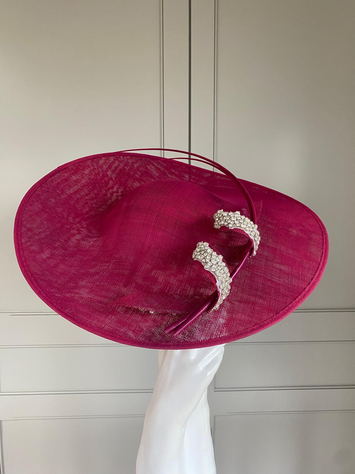 The Newcastle Dish hat comprises a large sinamay dish base with shallow crown. This is trimmed with a curl of sinamay covered in diamante detailing and is perfectly finished off with two elegant stripped quills.