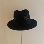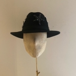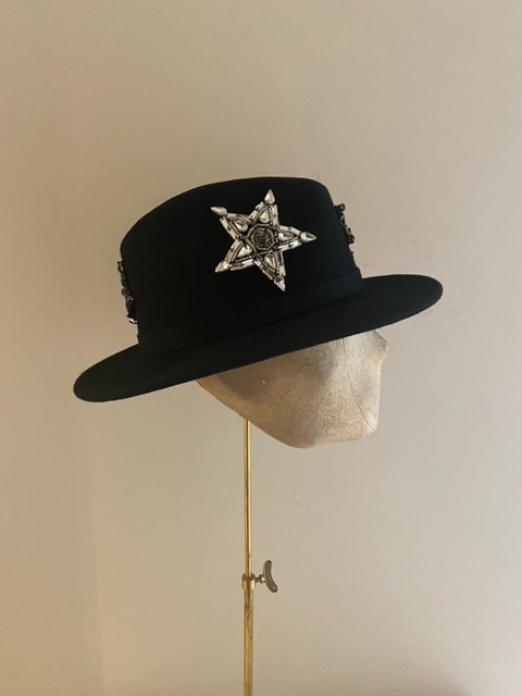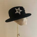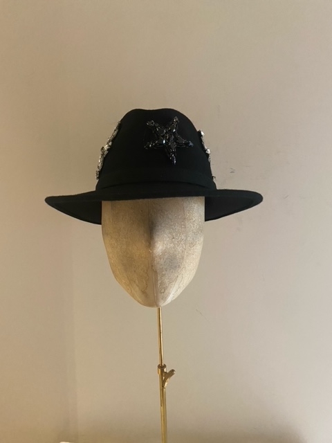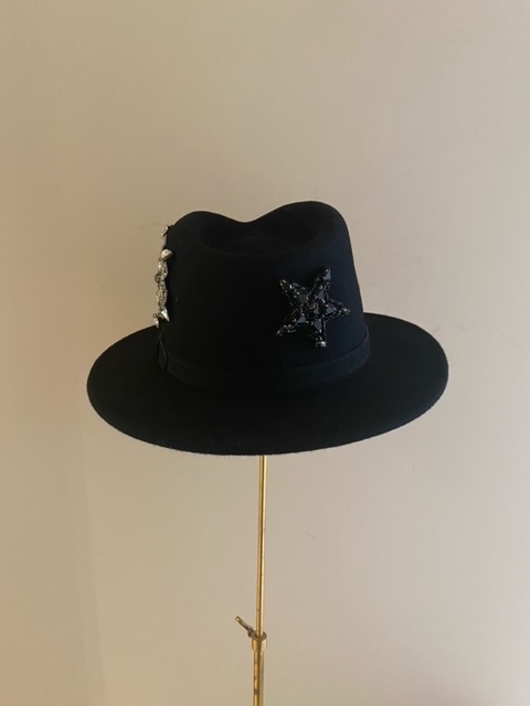 The Ready to Wear Black Reisling Fedora Hat would light up any winters day, and would look great teamed with a smart wool coat for a bonfire night celebration. The Reisling comprises a fedora hat base, trimmed with a Black leather hat band and adorned beautifully around the crown of the hat with sequined and jewelled stars in silver and black.