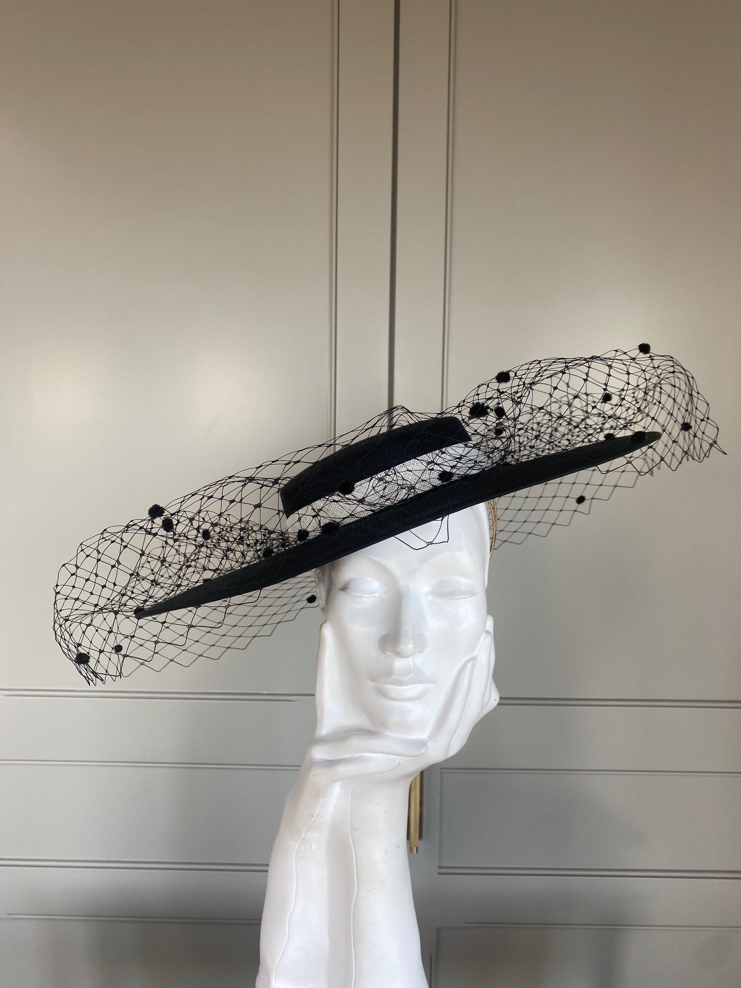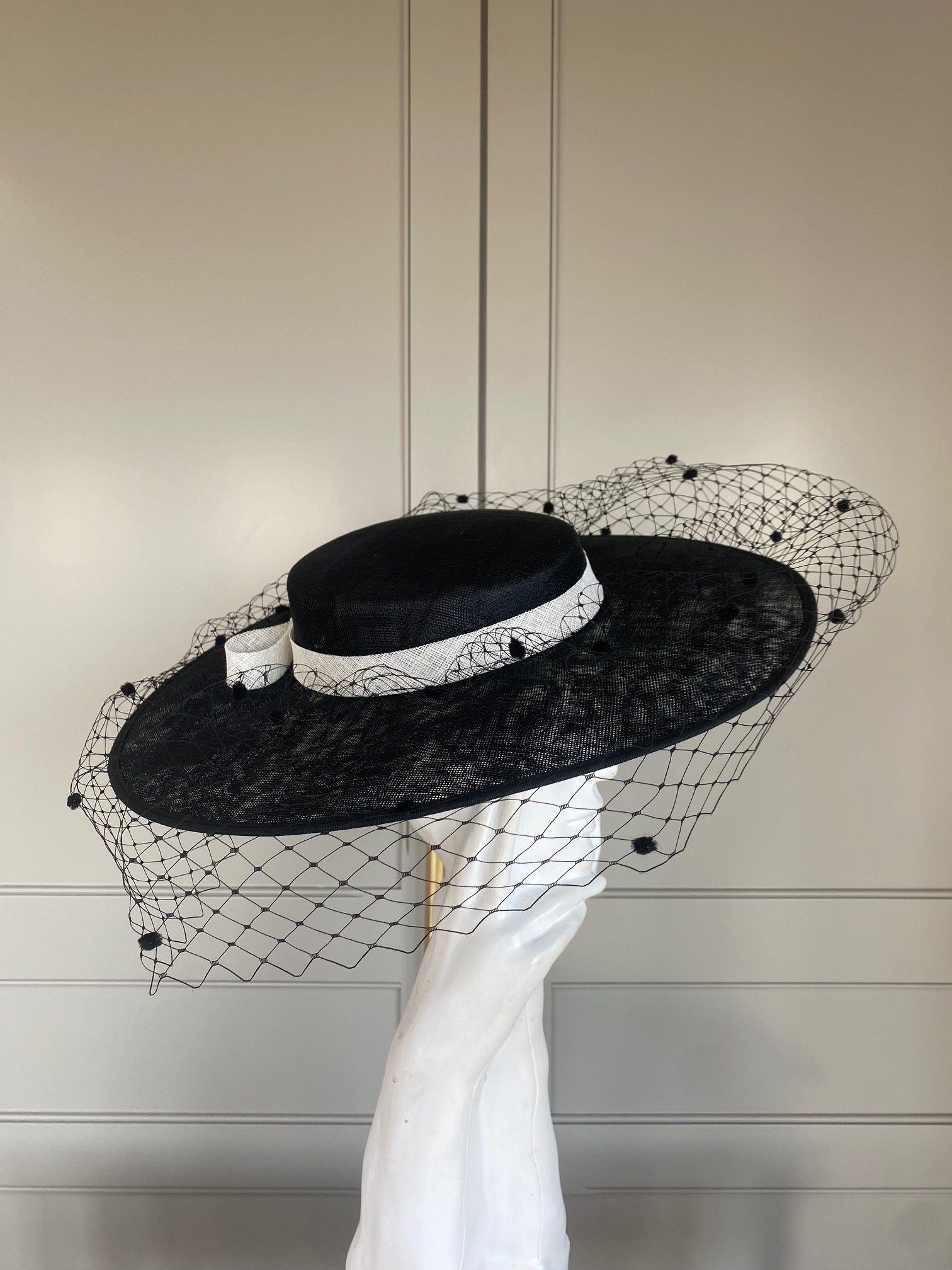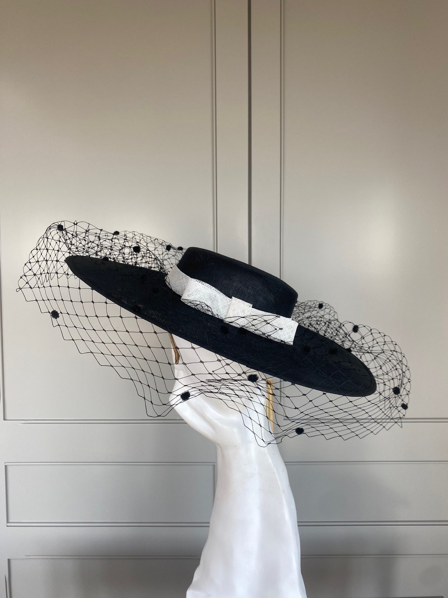 The Garfield hat is such an elegant and dramatic piece. It comprises a sinamay base with shallow yet structured crown which is encircled with a sinamay band and bow. The hat is finished off with dramatic spotted veiling.