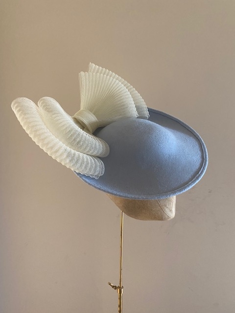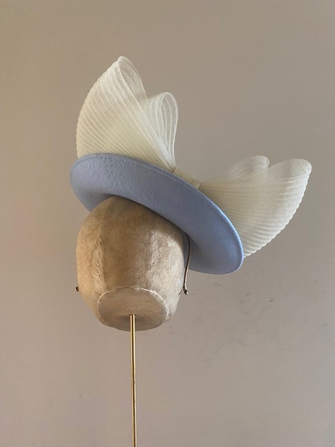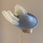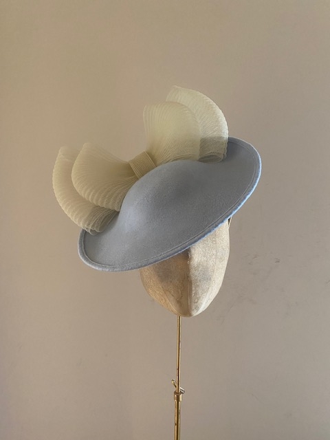 The Fumé Dish Hat is a very elegant hat that is perfect for a winter wedding. The Fumé dish hat comprises a felt dish base trimmed to the back with a pleated crinoline statement double bow.