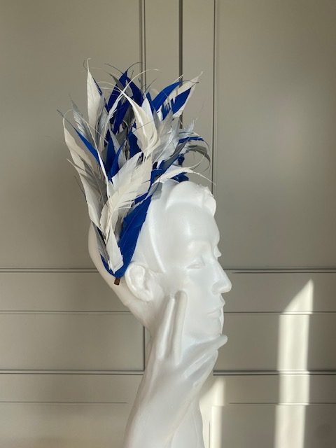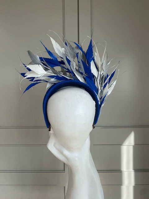 The Wilton Headband is a beautifully delicate head piece. It comprises a wide sinamay band mounted to a comfortable double headband trimmed with an array of arrowhead shaped feathers.
