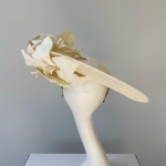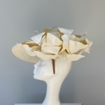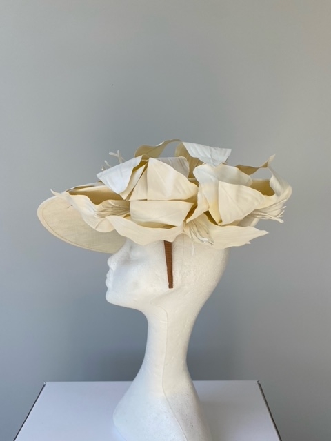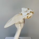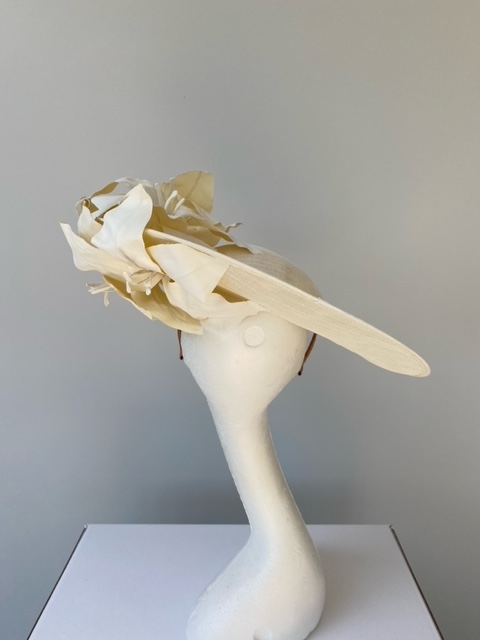 The Tropez Dish Hat is a gorgeous and very feminine dish hat. The hat comprises a dish base trimmed to one side with silk style lillies, two being above and three being below the brim.
