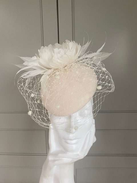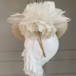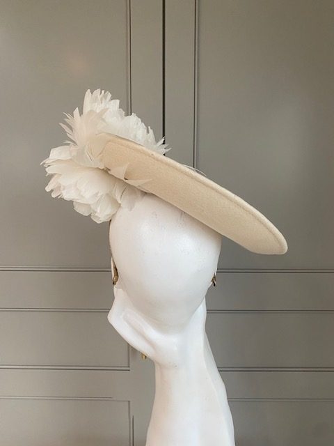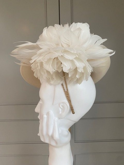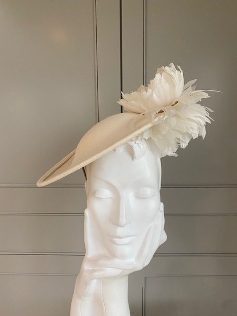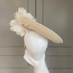 The Honeysuckle dish hat is a beautiful hat, especially in these soft neutral colours. The hat comprises a 12″ felt dish base trimmed to the top and underside of the brim with soft feather flowers.