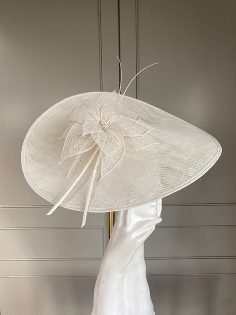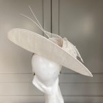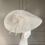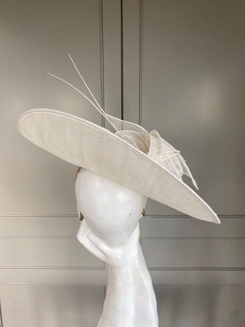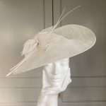 Designed to perfectly compliment a number of John Charles’ beautiful dresses, the Lincoln hat comprises a large sinamay dish base with shallow crown. This is trimmed with  a flower constructed of sinamay petals, perfectly finished off with two elegant stripped quills.