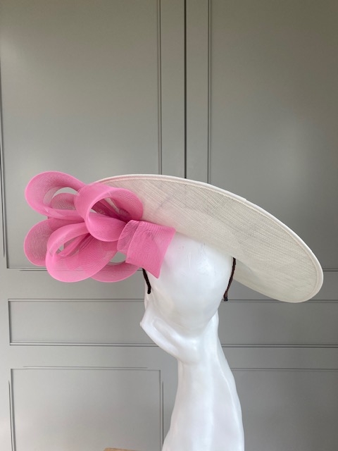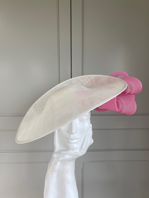 The Vichy Dish hat comprises a large dish base with upturn to the back and shallow crown detail trimmed on the underside of the brim with generous loops of crinoline.
