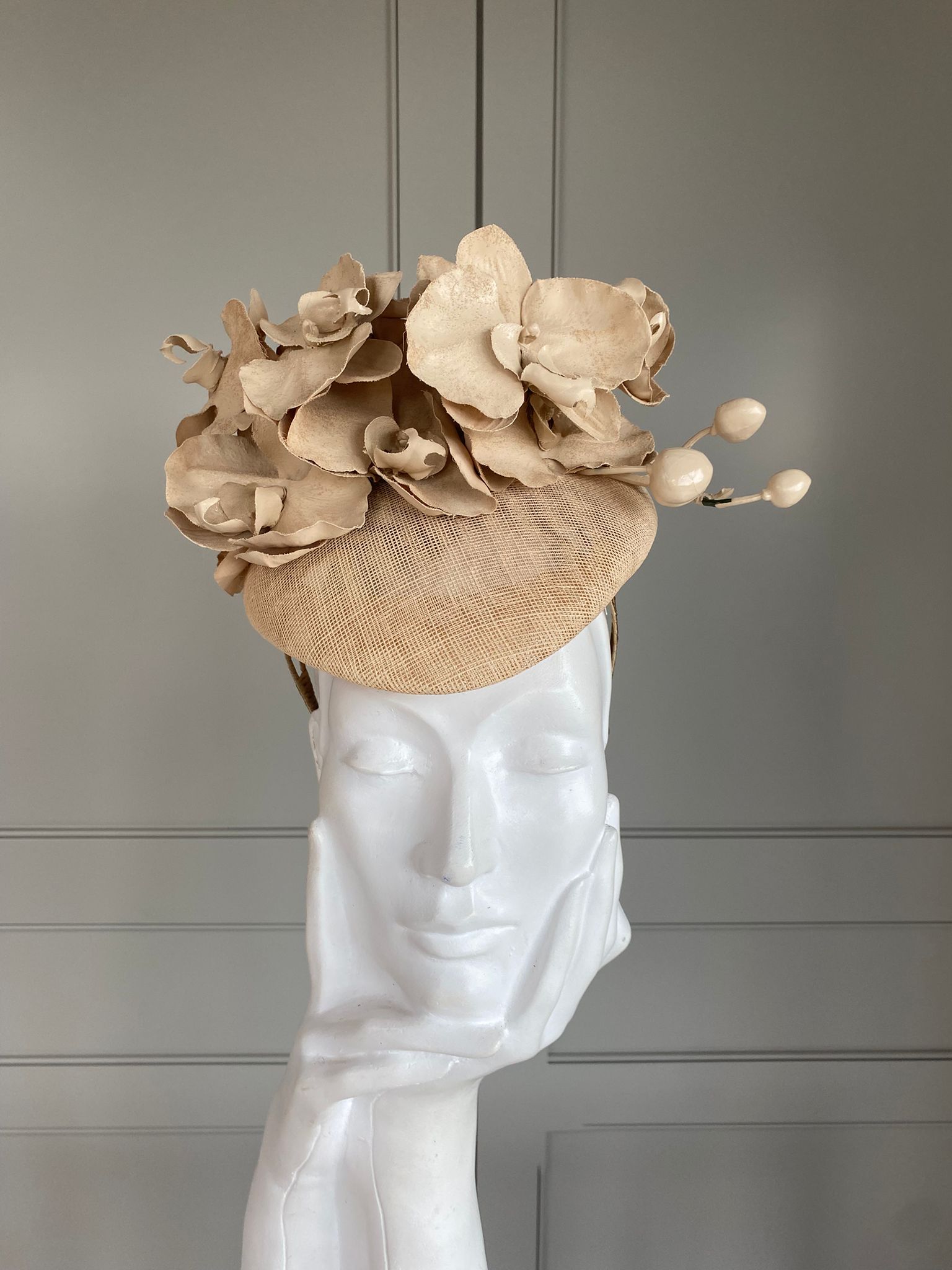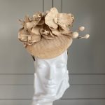The Leigh Pillbox hat is so pretty and chic. This pillbox hat features a sinamay base trimmed with beautiful ornamental orchids. We love this hat and think that this would be perfect for a day at the races or for a wedding guest hat.