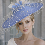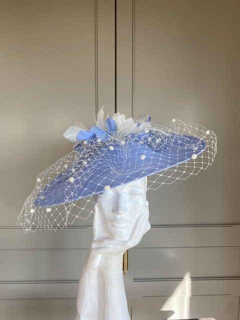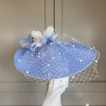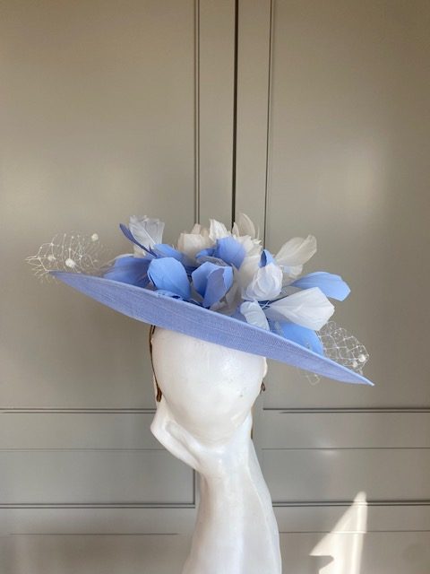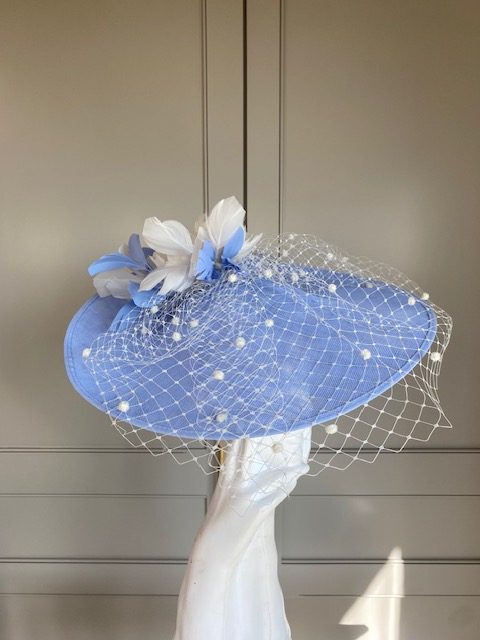 The John Charles Ancaster Hat comprises a dish style base trimmed with spotted netting topped with feather flowers interspersed with cut feathers.