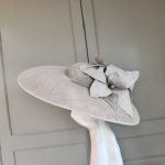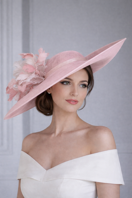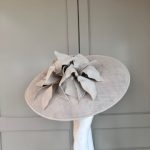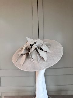 The John Charles Chester Hat comprises a dish style base with shallow crown trimmed with a contrasting hat band. This is then topped with two flowers and sinamay leaf detail.