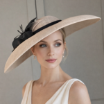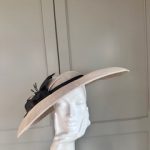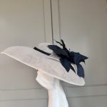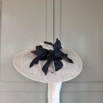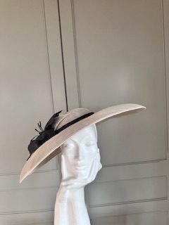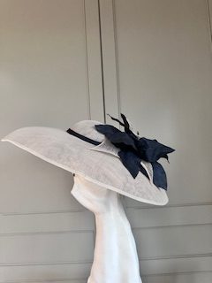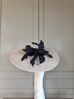 The John Charles Chester Hat comprises a dish style base with shallow crown trimmed with a contrasting hat band. This is then topped with two flowers and sinamay leaf detail.