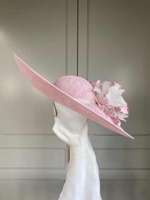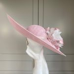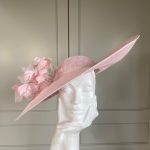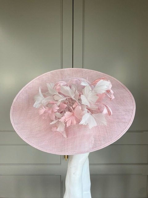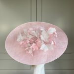 The Cambridge hat comprises a large sinamay dish base with shallow crown offset by a contrasting sinamay band. The hat is then trimmed with a spray of zig-zag trimmed feathers interspersed with beautiful crystals and has been designed exclusively for John Charles’ dress collection.