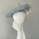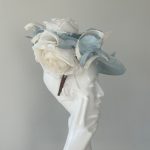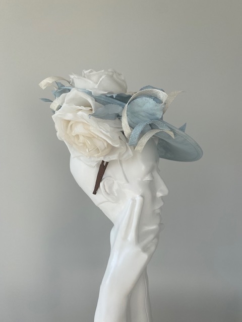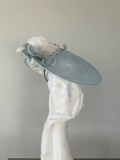 Elegant, and feminine the Crawford dish hat is a must have for a romantic summer wedding. The Crawford dish hat is made up of a sinamay dish base adorned with a silk rose and twirled trimmings.