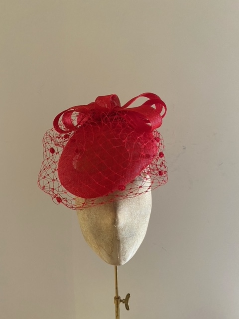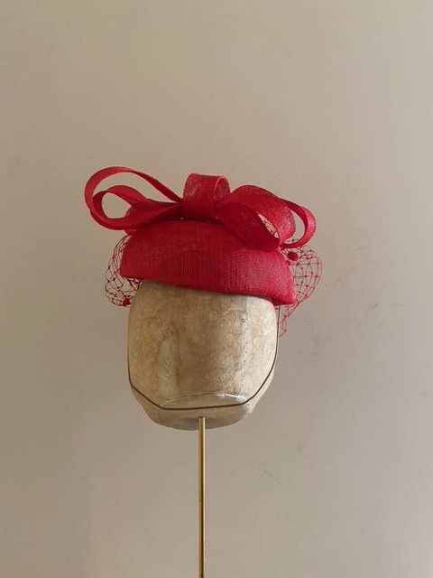 The Penrith Pillbox hat is a great and easy to wear summer wedding or race day hat. The hat comprises a sinamay pillbox base trimmed with a sinamay looped bow to the back and, for some extra drama, polka dot veiling.