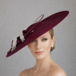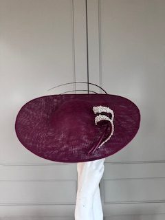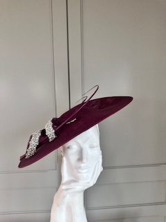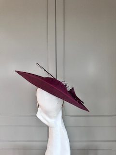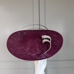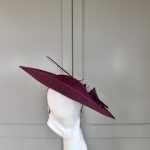 Designed to perfectly compliment a number of John Charles’ beautiful dresses, the Newcastle Dish hat comprises a large sinamay dish base with shallow crown. This is trimmed with a curl of sinamay covered in diamante detailing and is perfectly finished off with two elegant stripped quills.