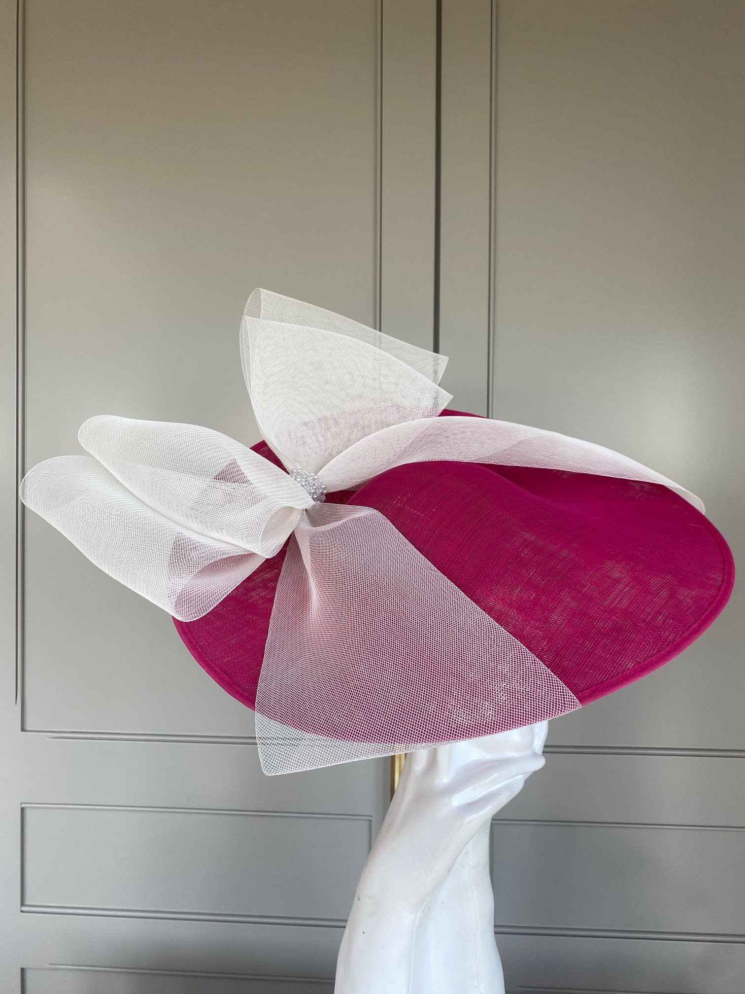 The John Charles Penzance Hat comprises a sinamay dish base  trimmed to the back with a large bow, which wraps under the base. The centre of the bow is finished off with pearl detailing.