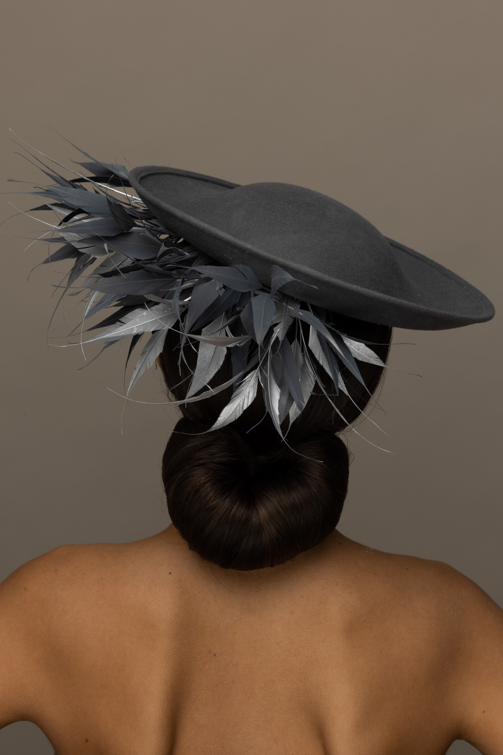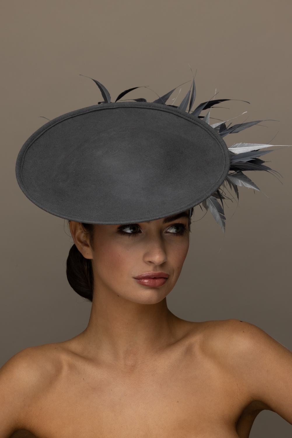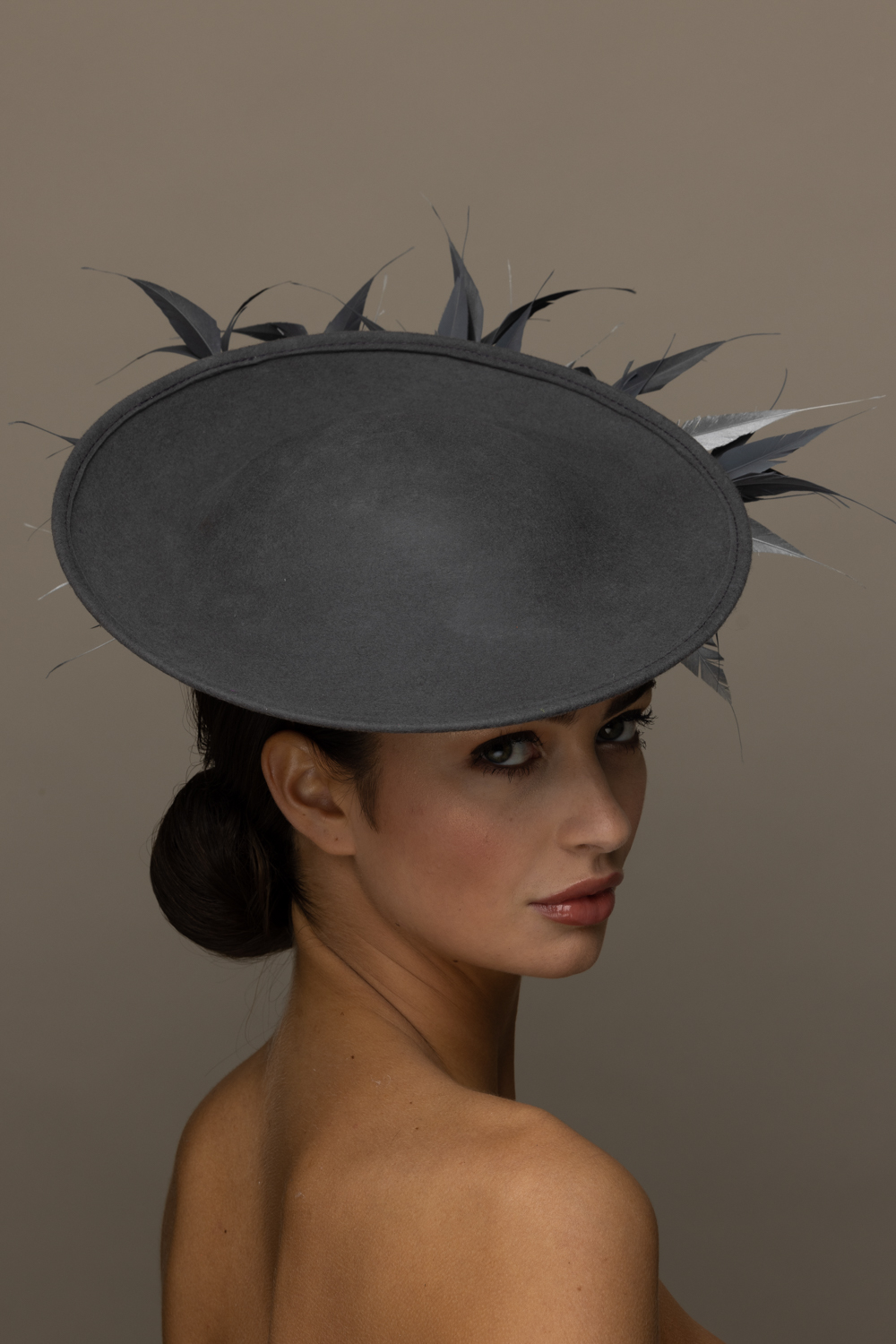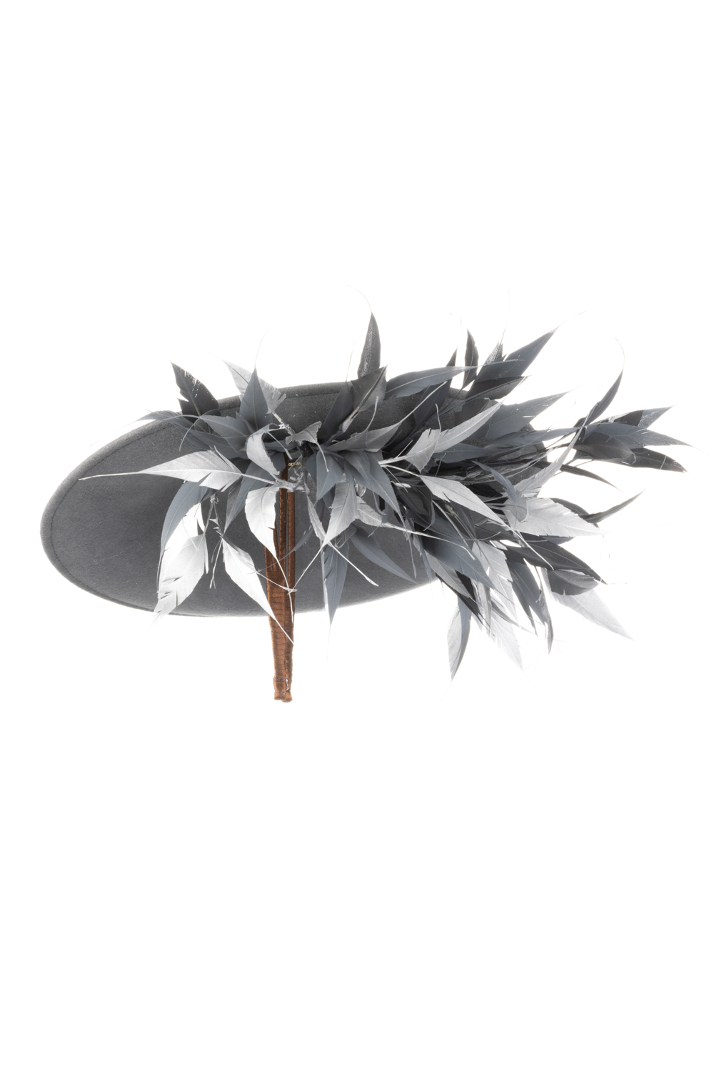 The Redwood dish hat comprises a 12″ felt dish base trimmed to the back on the underside of the brim with spiked feathers.