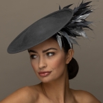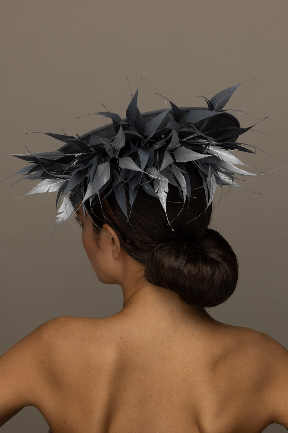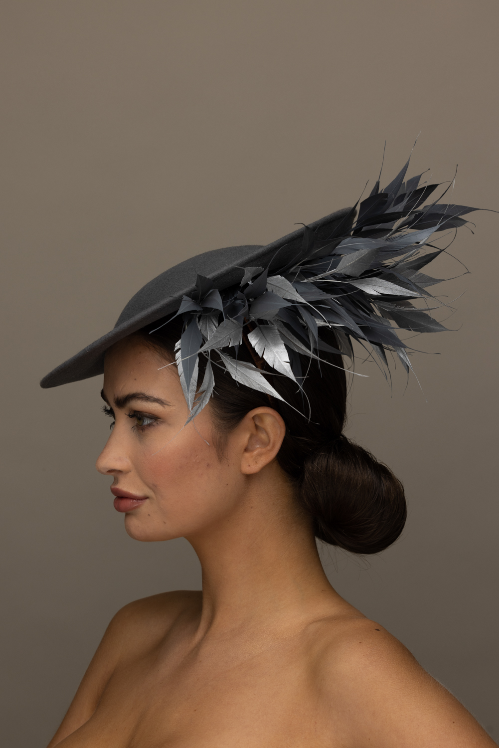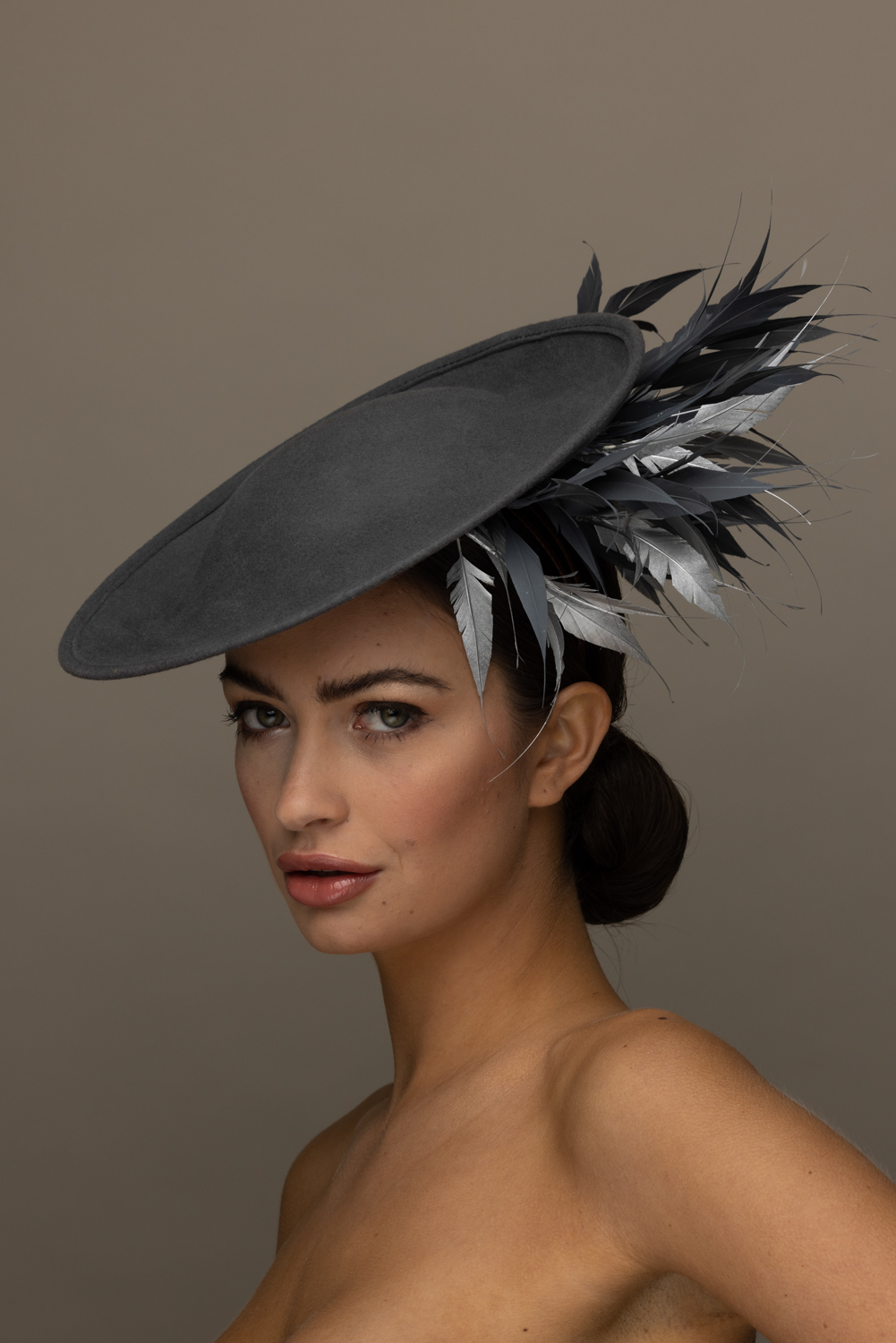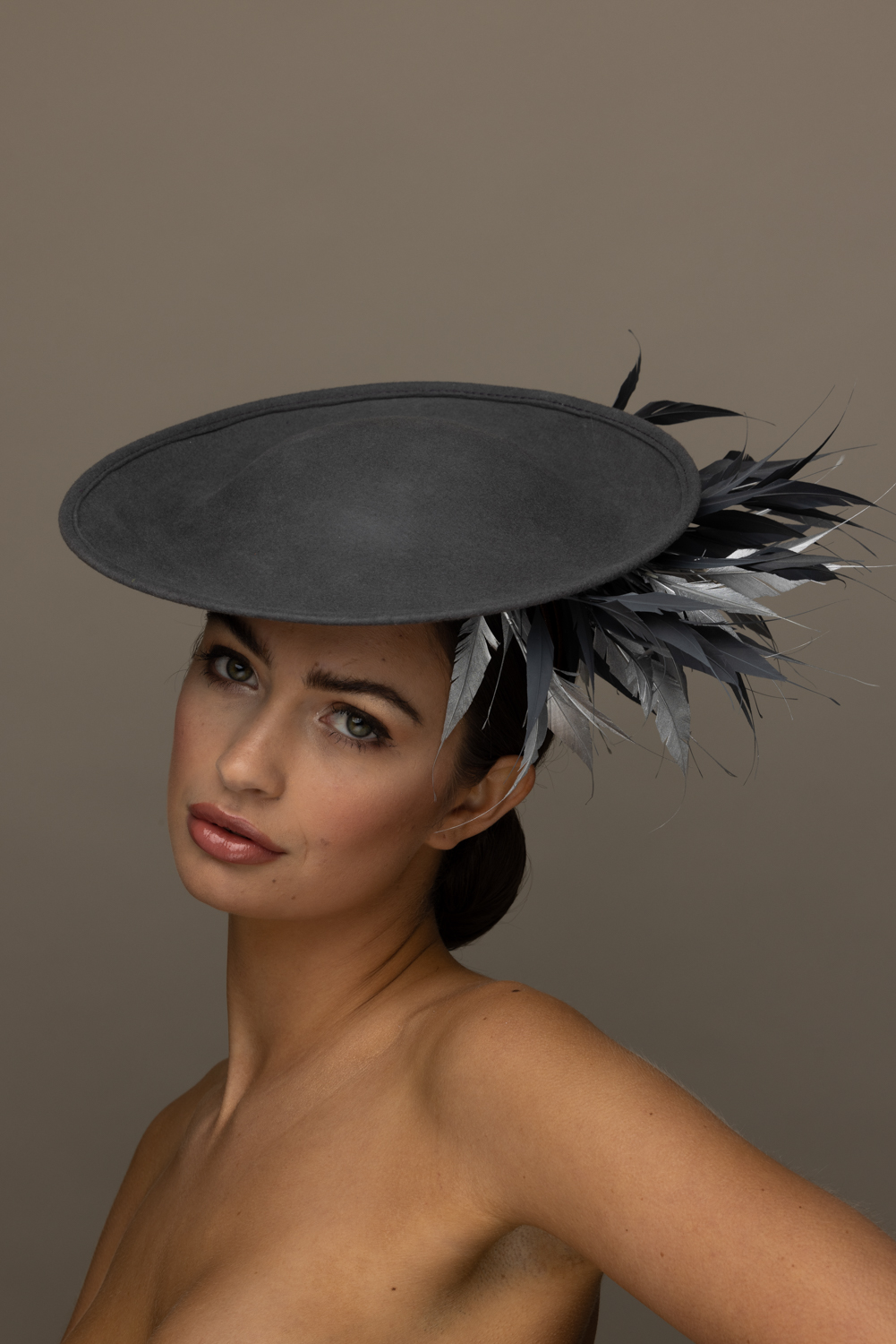 The Redwood dish hat comprises a 12″ felt dish base trimmed to the back on the underside of the brim with spiked feathers.
