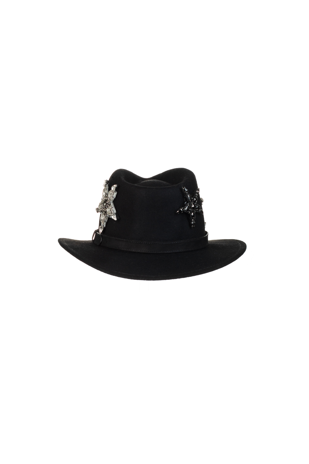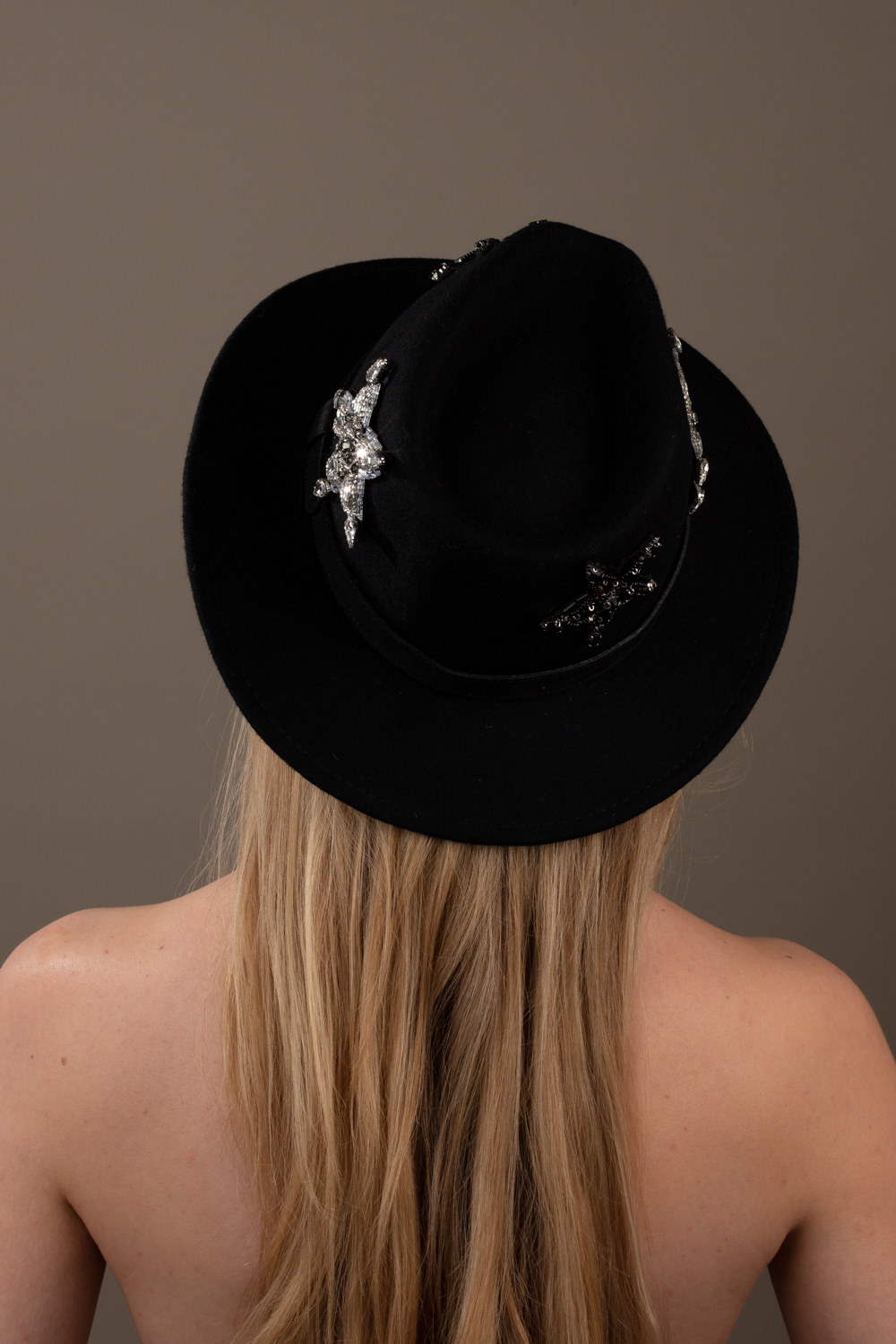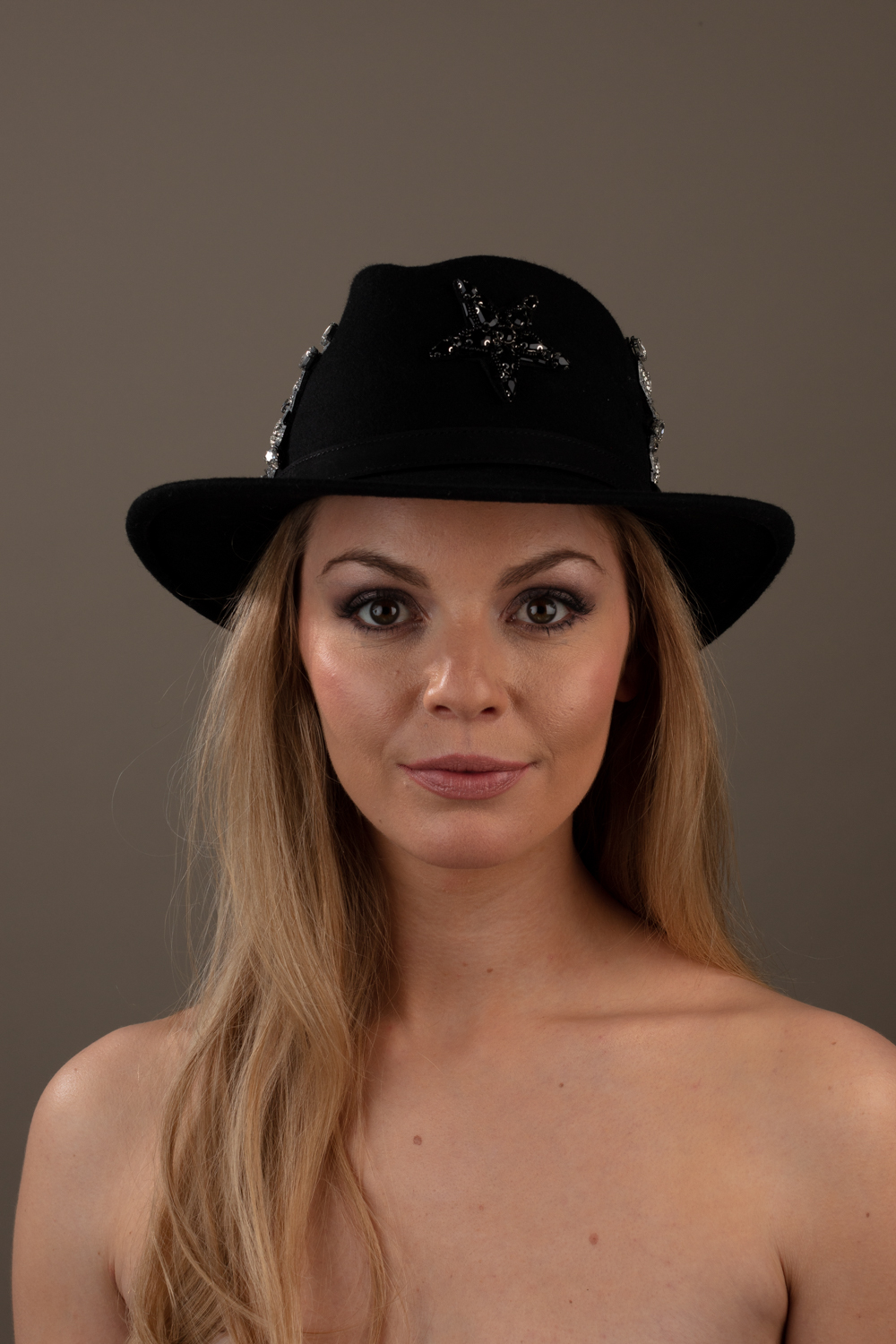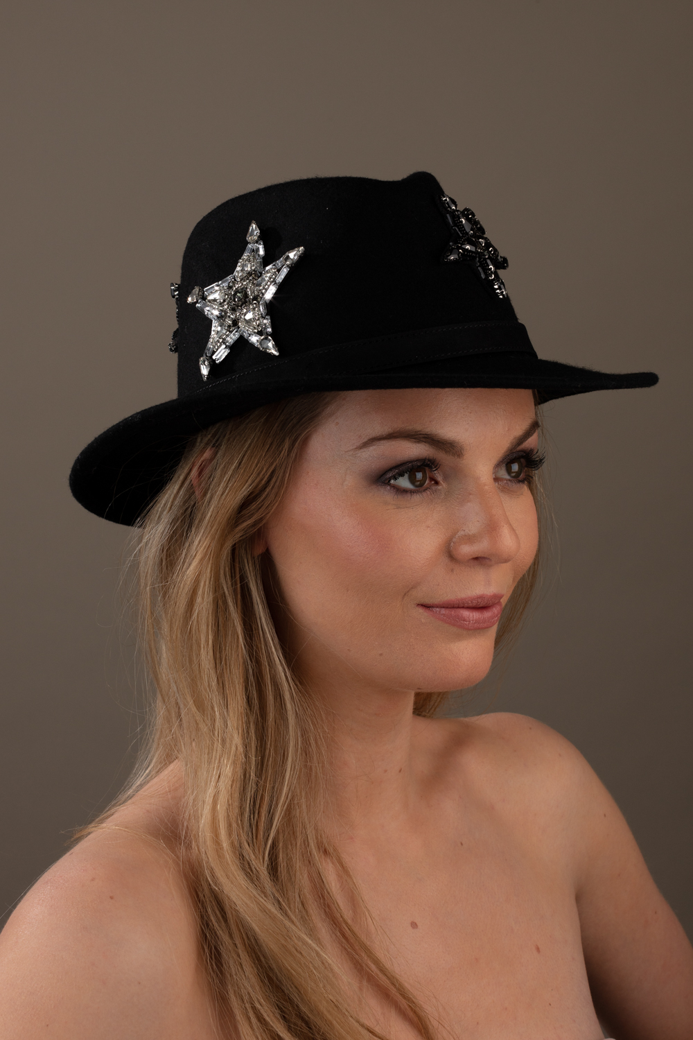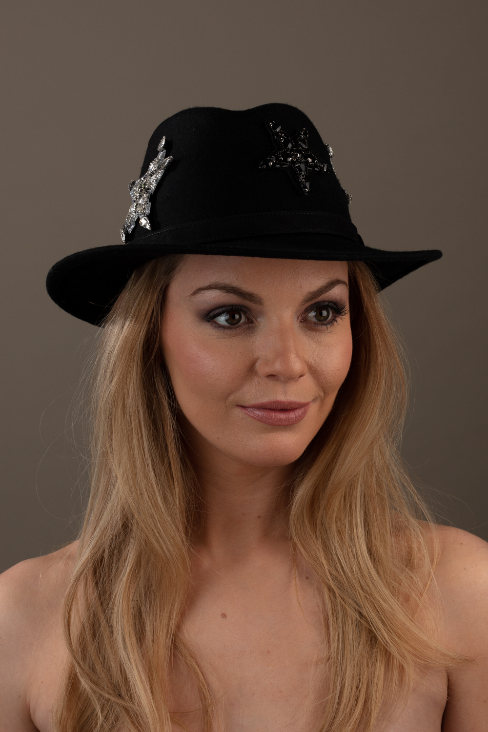 The Reisling Fedora Hat would light up any winters day, and would look great teamed with a smart wool coat for a bonfire night celebration. The Reisling comprises a fedora hat base, trimmed with a leather hat band and adorned beautifully around the crown of the hat with sequined and jewelled stars in silver and black.
