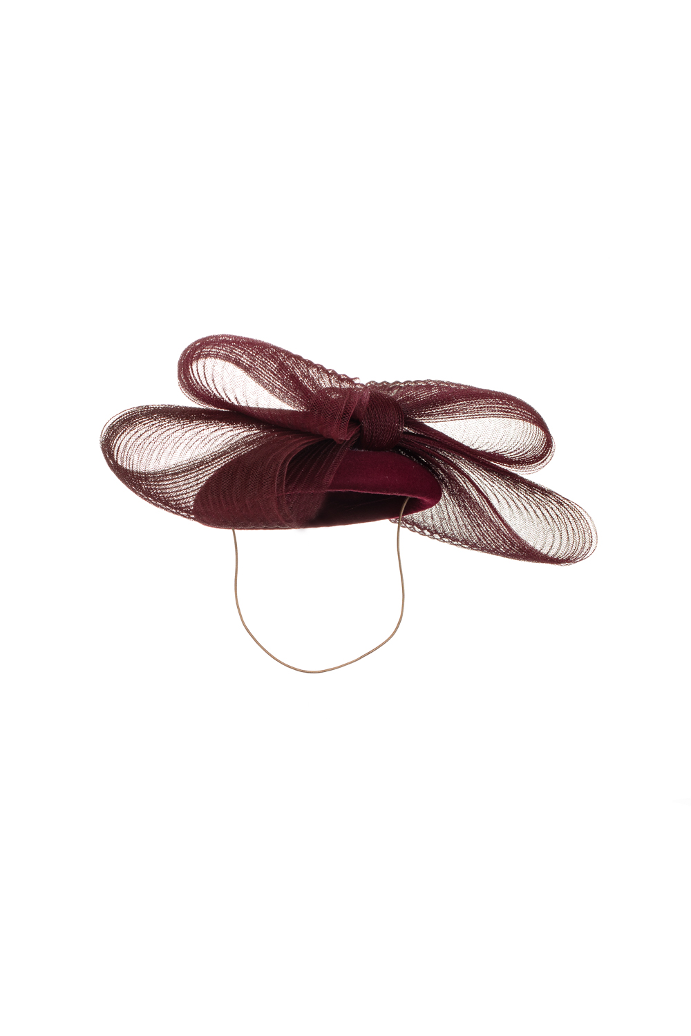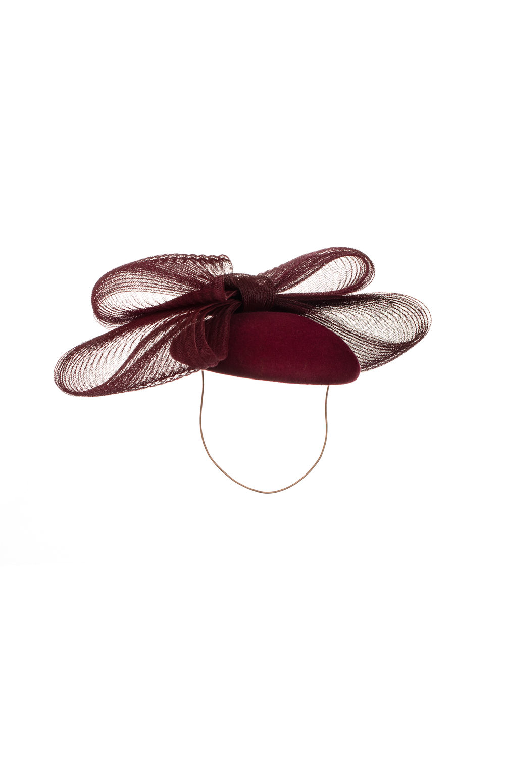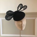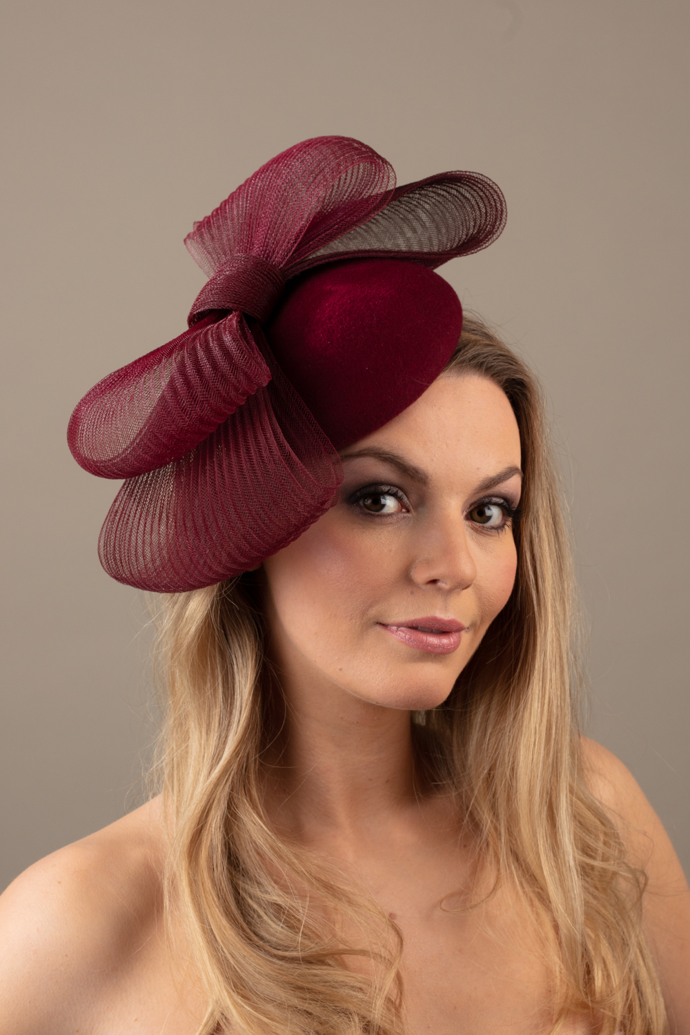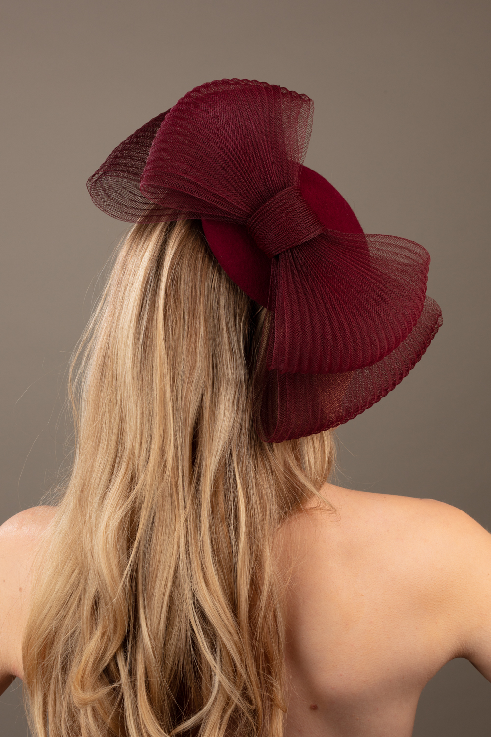 The stunning Rioja Pillbox Hat comprises a felt pillbox base trimmed with a statement double bow to the back made from pleated crinoline.