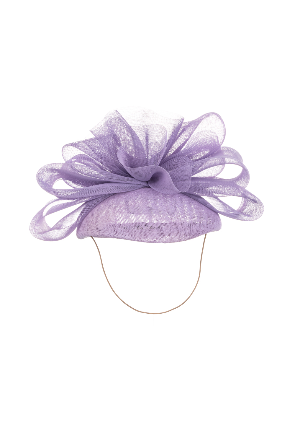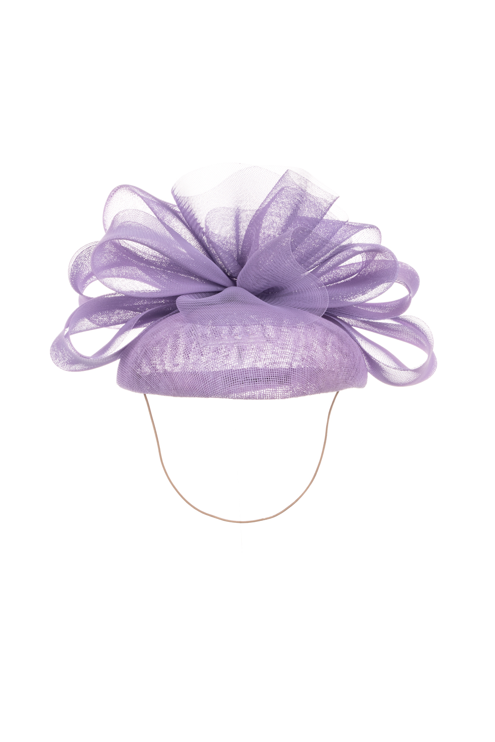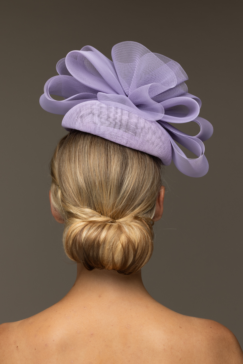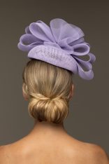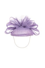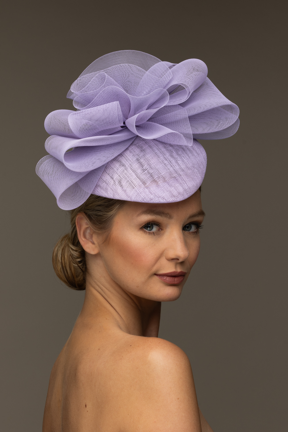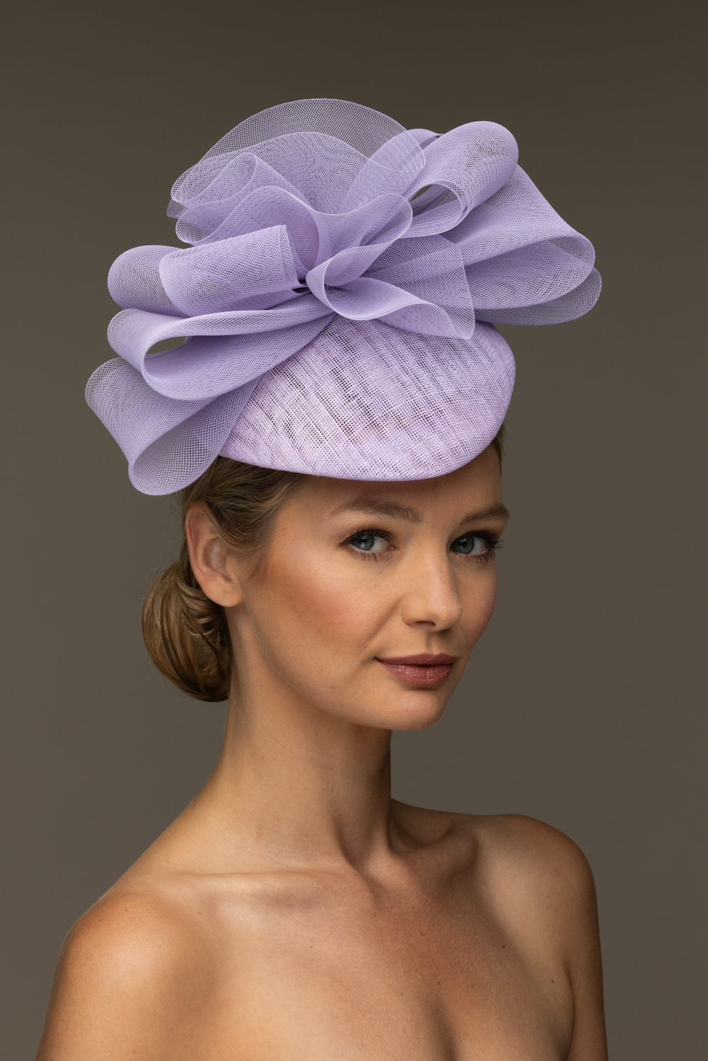 The Russel Pillbox hat comprises a sinamay pillbox base trimmed with a crinoline bow and crinoline loops either side.