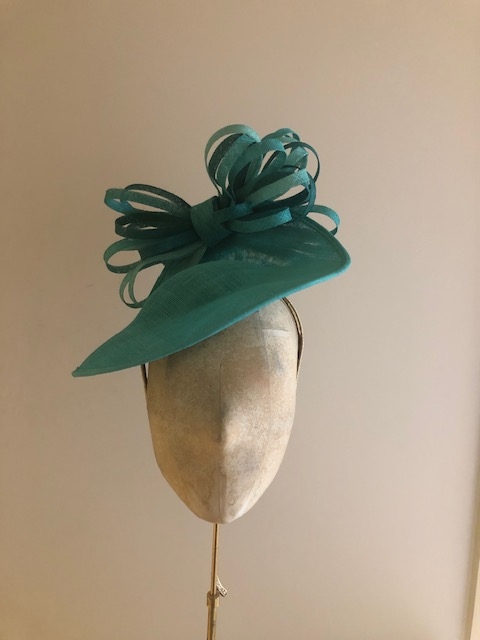 A diamond shaped dish hat with loops of sinamay in a bow on the front and back, on band.