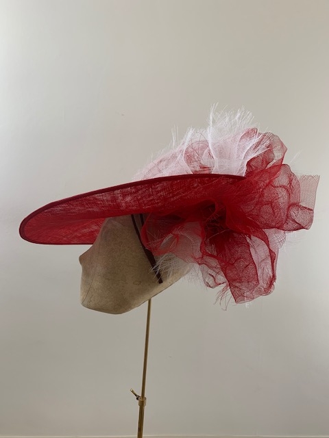 This Hat comprises a 18″ dish decorated beautifully with Six distressed crinoline each with a single red flower in the centre. The crinoline sits at the back of the hat with Three on top an three underneath. Hat is fitted with a headband.