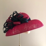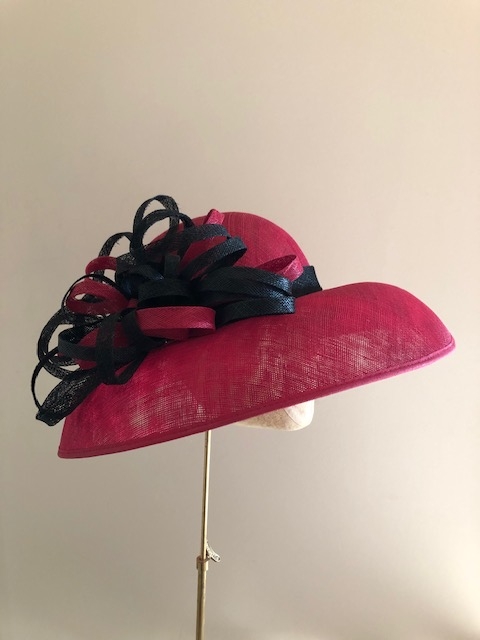 This Hat comprises a down ward turned brim adorned with an array of loops in different sizes in Two colours. Hat sits directly onto your head.