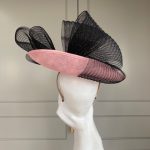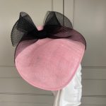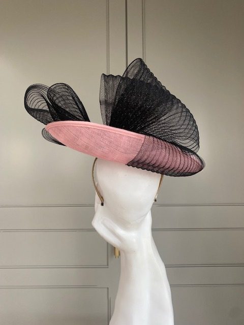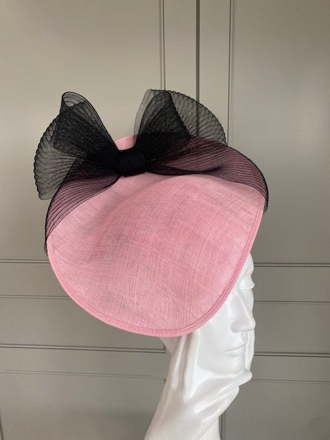 A Sinamay teardrop dish base, trimmed with a pleated crinoline bow