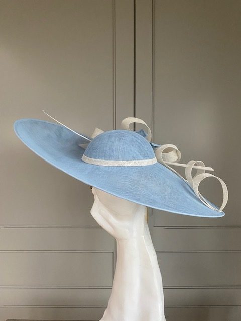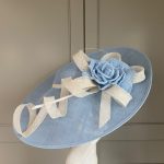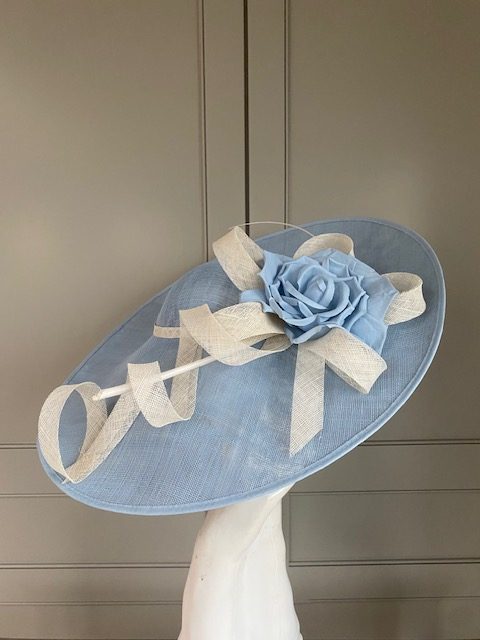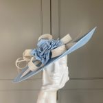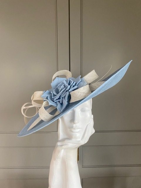 The sinamay hat features a crown with east to west angled brim with an upturn to the top side. The hat is then trimmed with sinamay loops, a rose & quill.