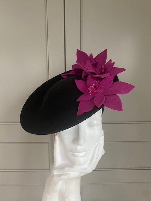 A felt pillbox hat trimmed with ivory roses and ivory feathers