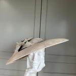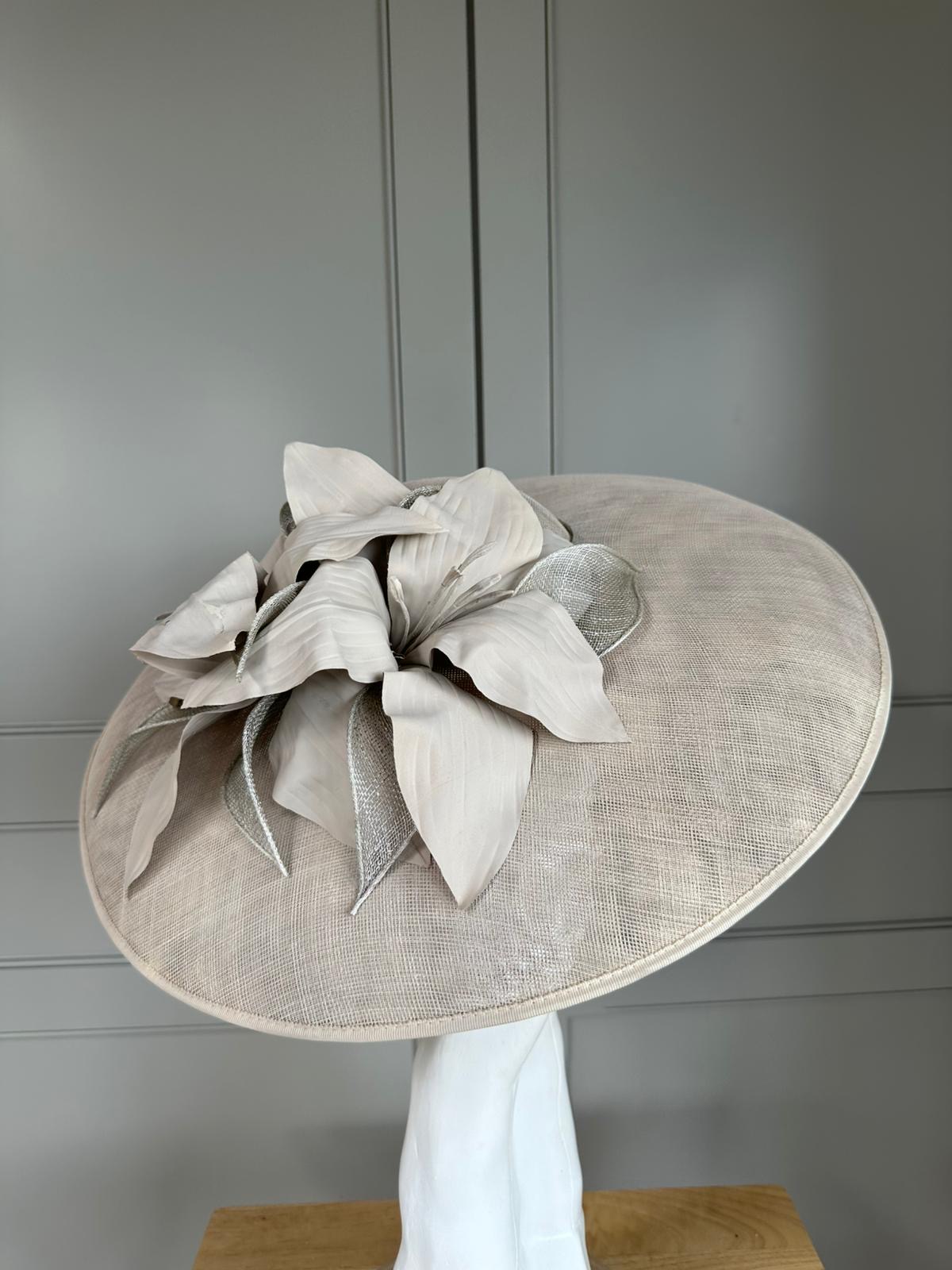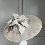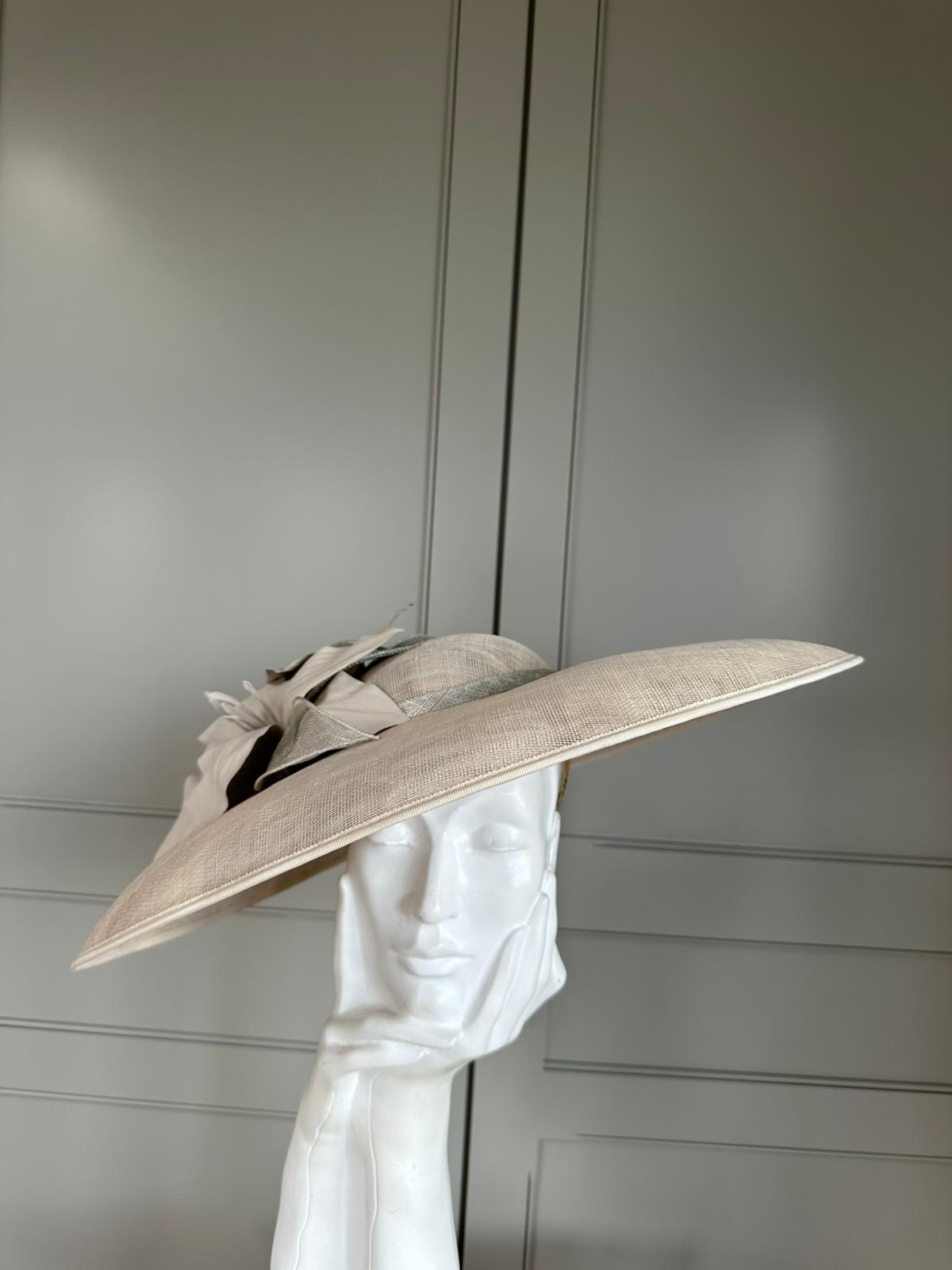 A cross weave sinamay brim with a shallow crown, trimmed with a sinamay bow.