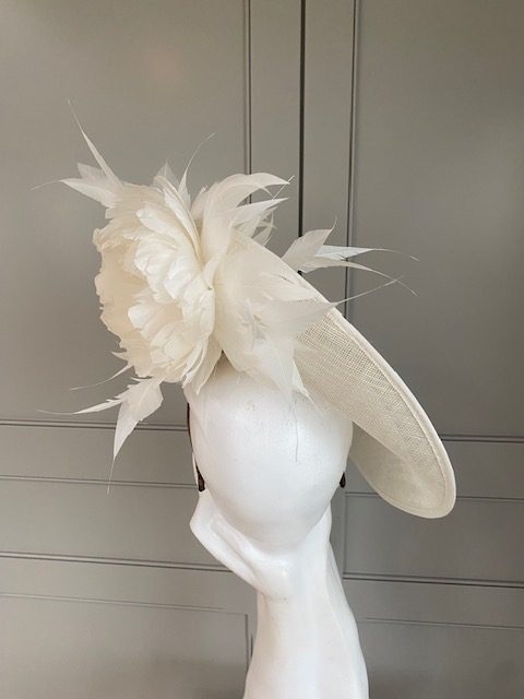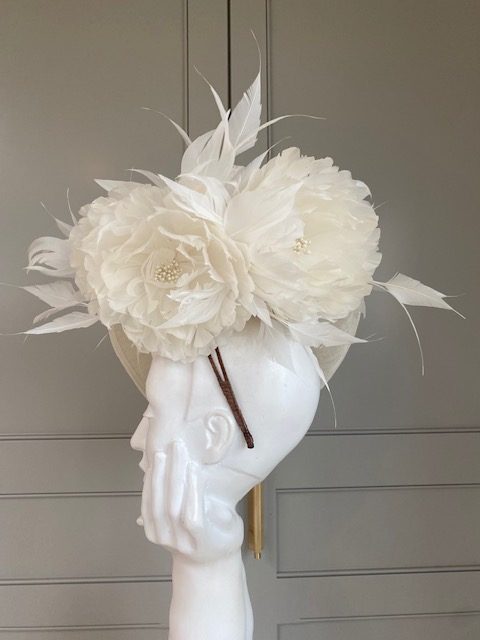 A sinamay dish moulded closely to the head trimmed with feather flowers
