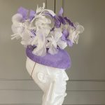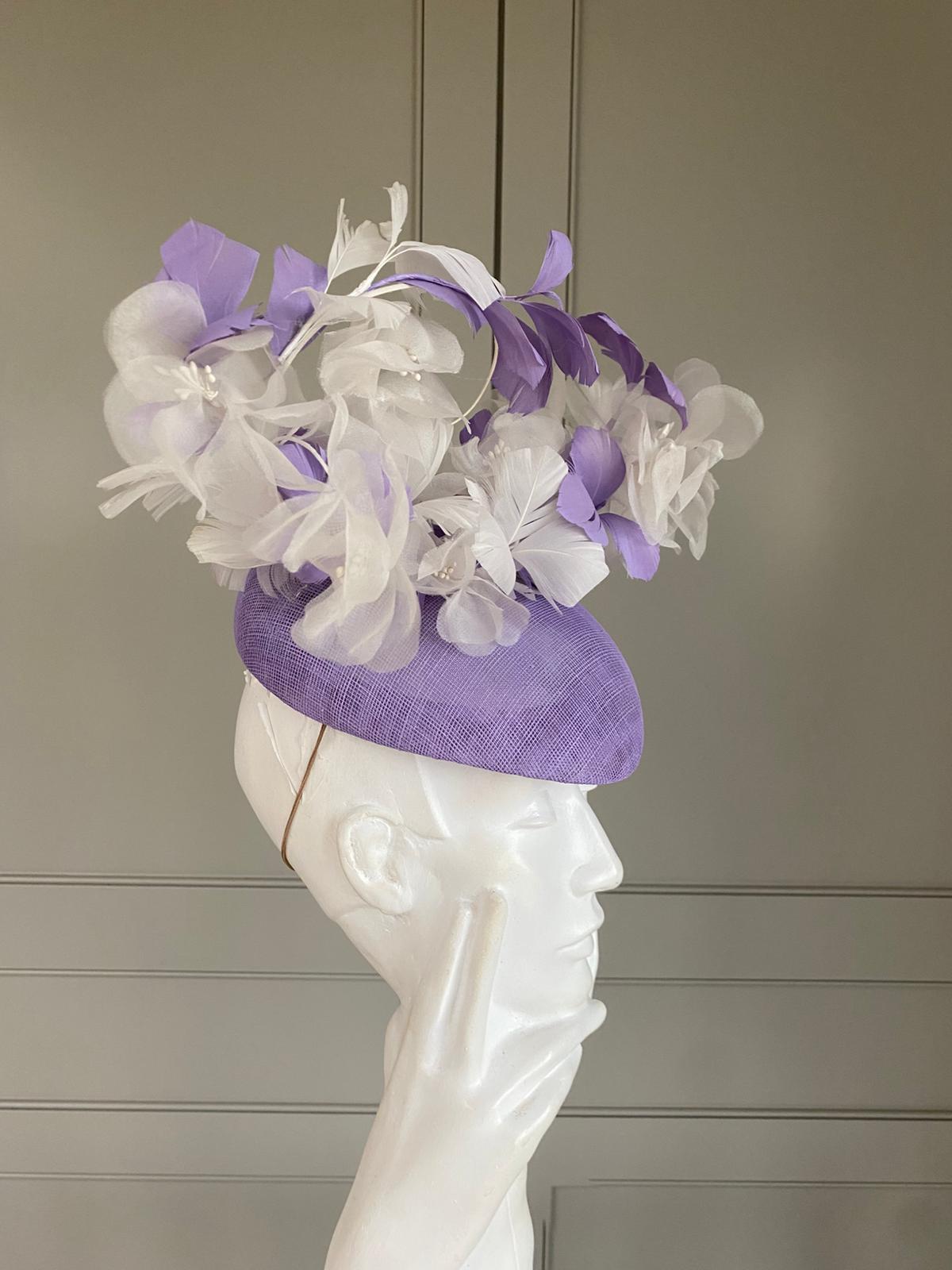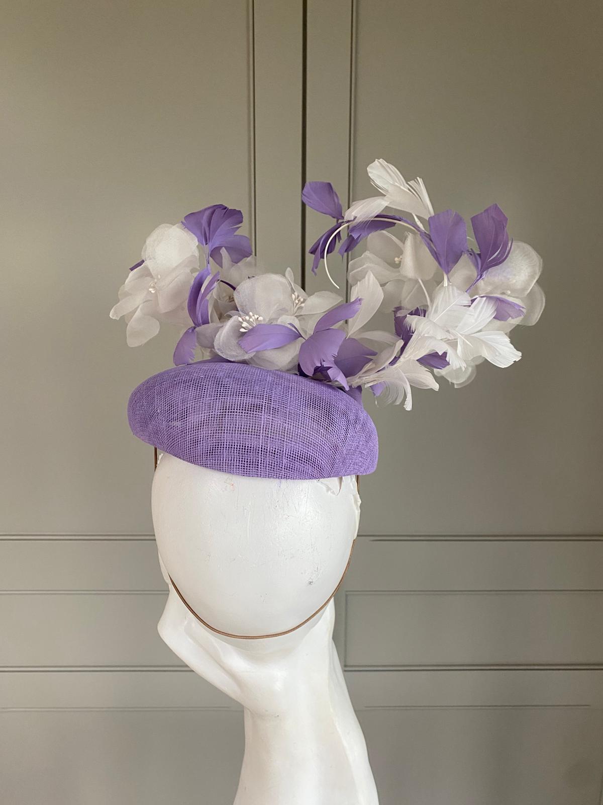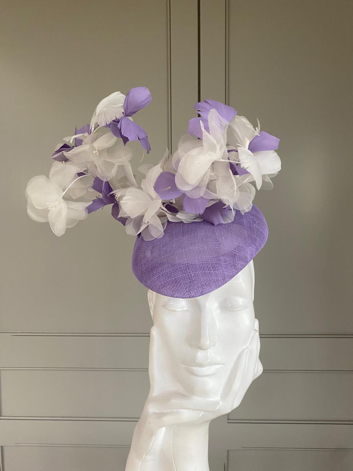 A sinamay pillbox hat, trimmed with curled quills encased with feathers and organiser flowers.