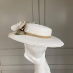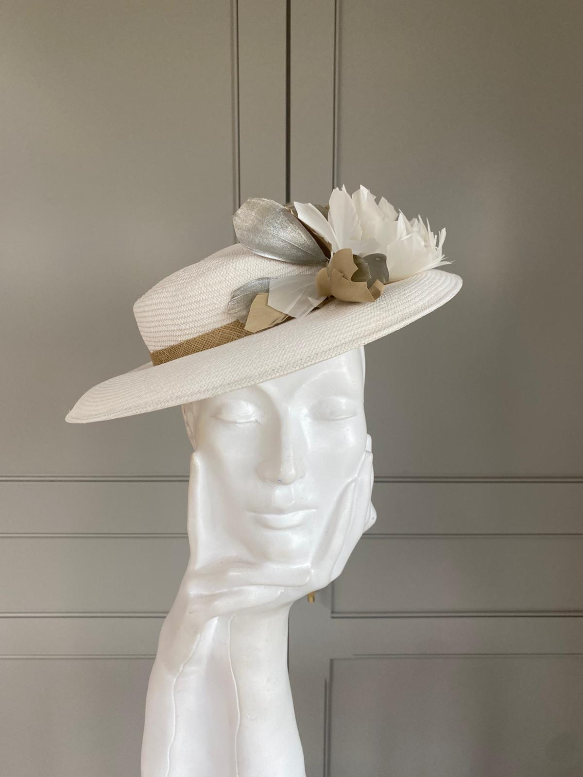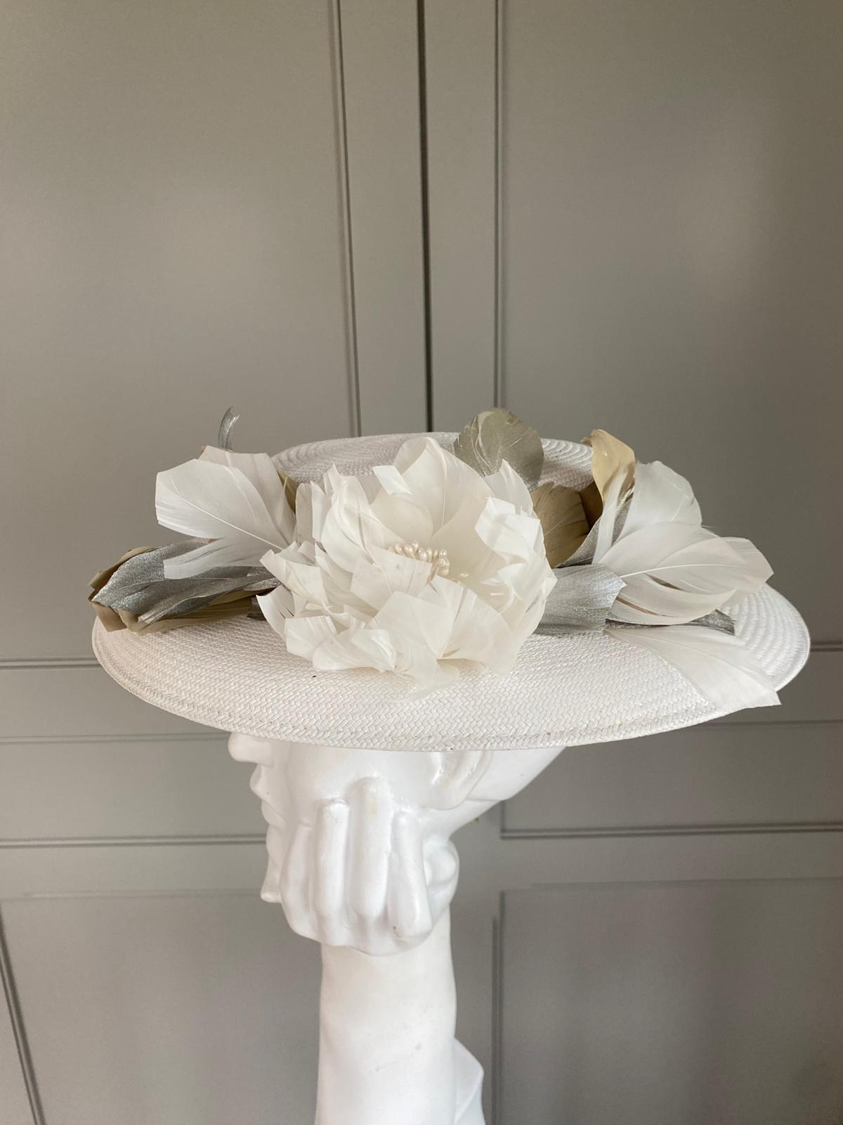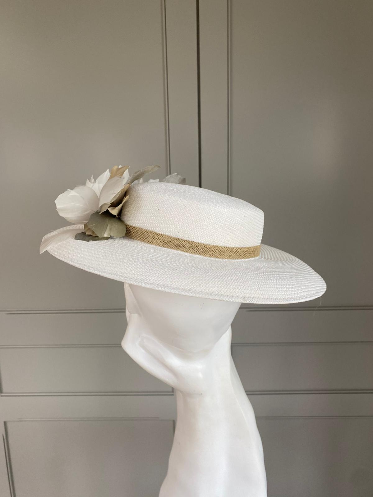 A straw boater hat, trimmed to one side with an ivory feather flower and coloured feathers