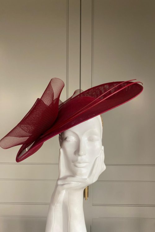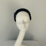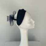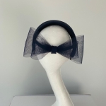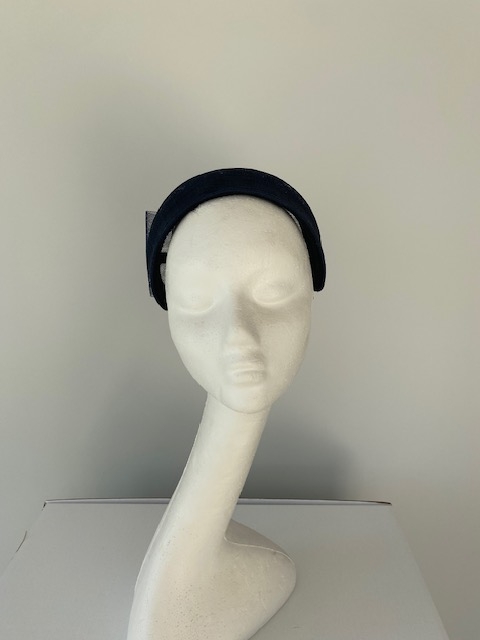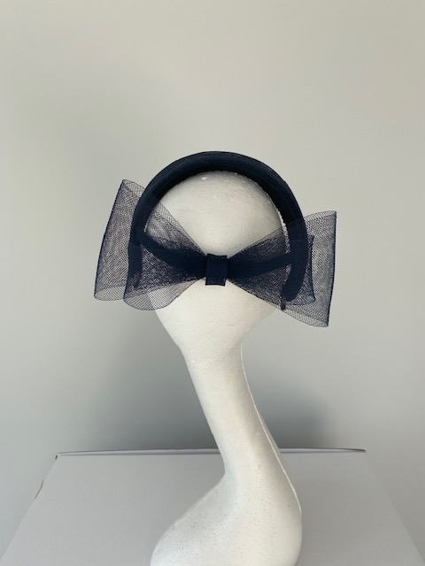 A wide sinamay band which is then trimmed to the back of the head with a looped bow made from plain crinoline in the same colour as the band.