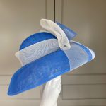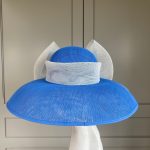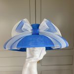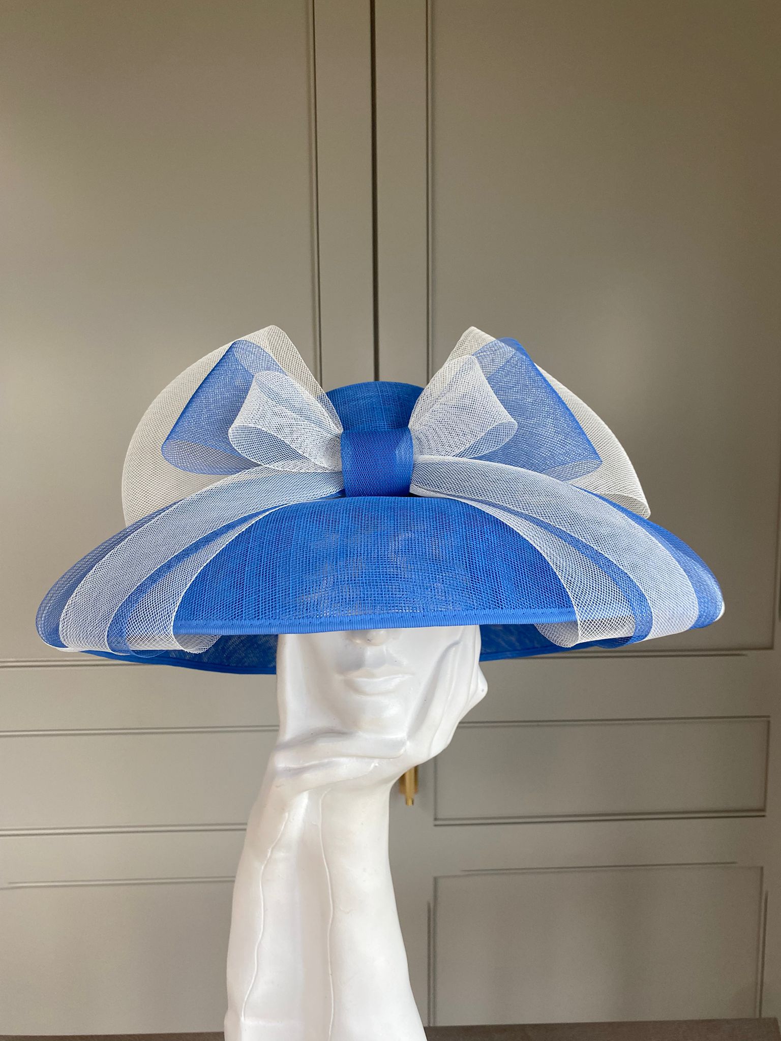 A sinamay base with a drop brim, trimmed with a two tone bow on the front of the hat