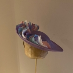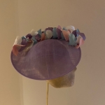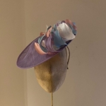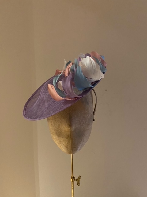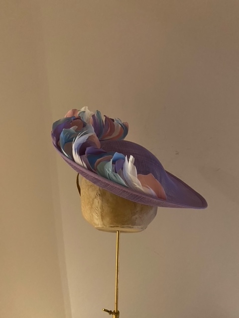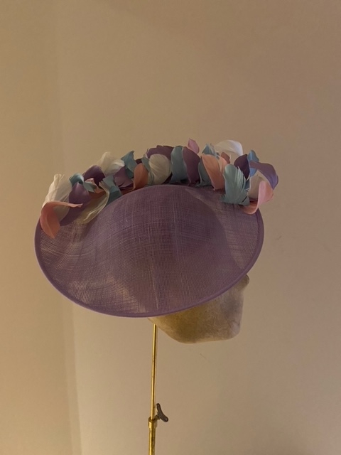 This Dish Hat is a very neat dish hat comprising a small sinamay dish base trimmed around half the circumference with short, curled feathers.