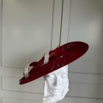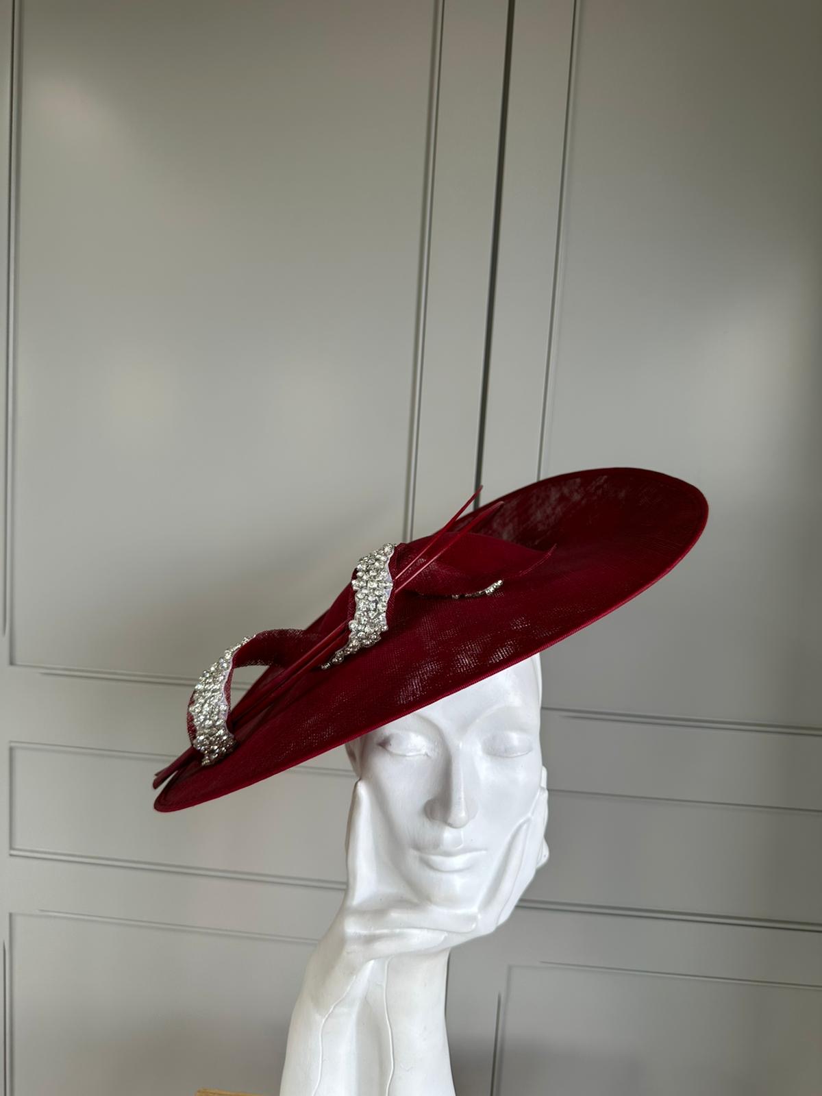 An 18″ sinamay dish, trimmed with a crystal diamanté twirl and finished with curled quills.
