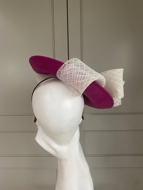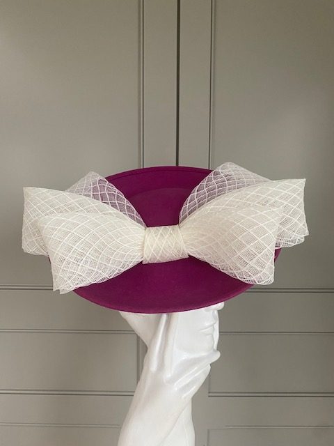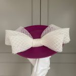A Fuchsia Pink Felt 12″ dish base, trimmed with a Shock White pure diamond crinoline bow