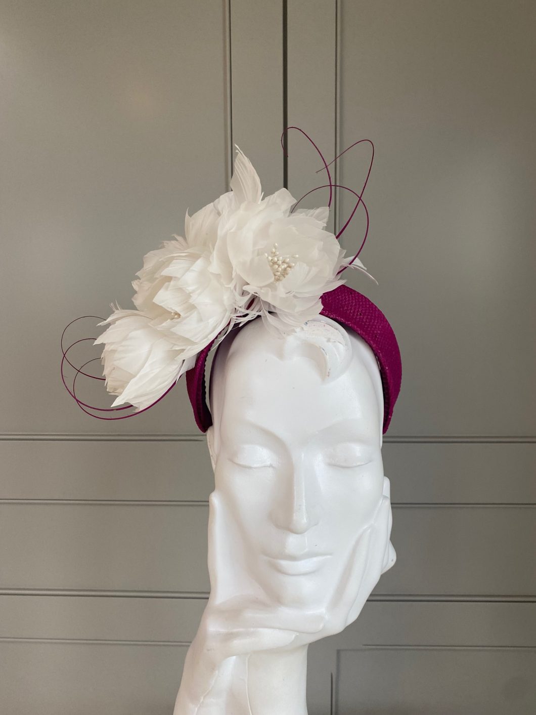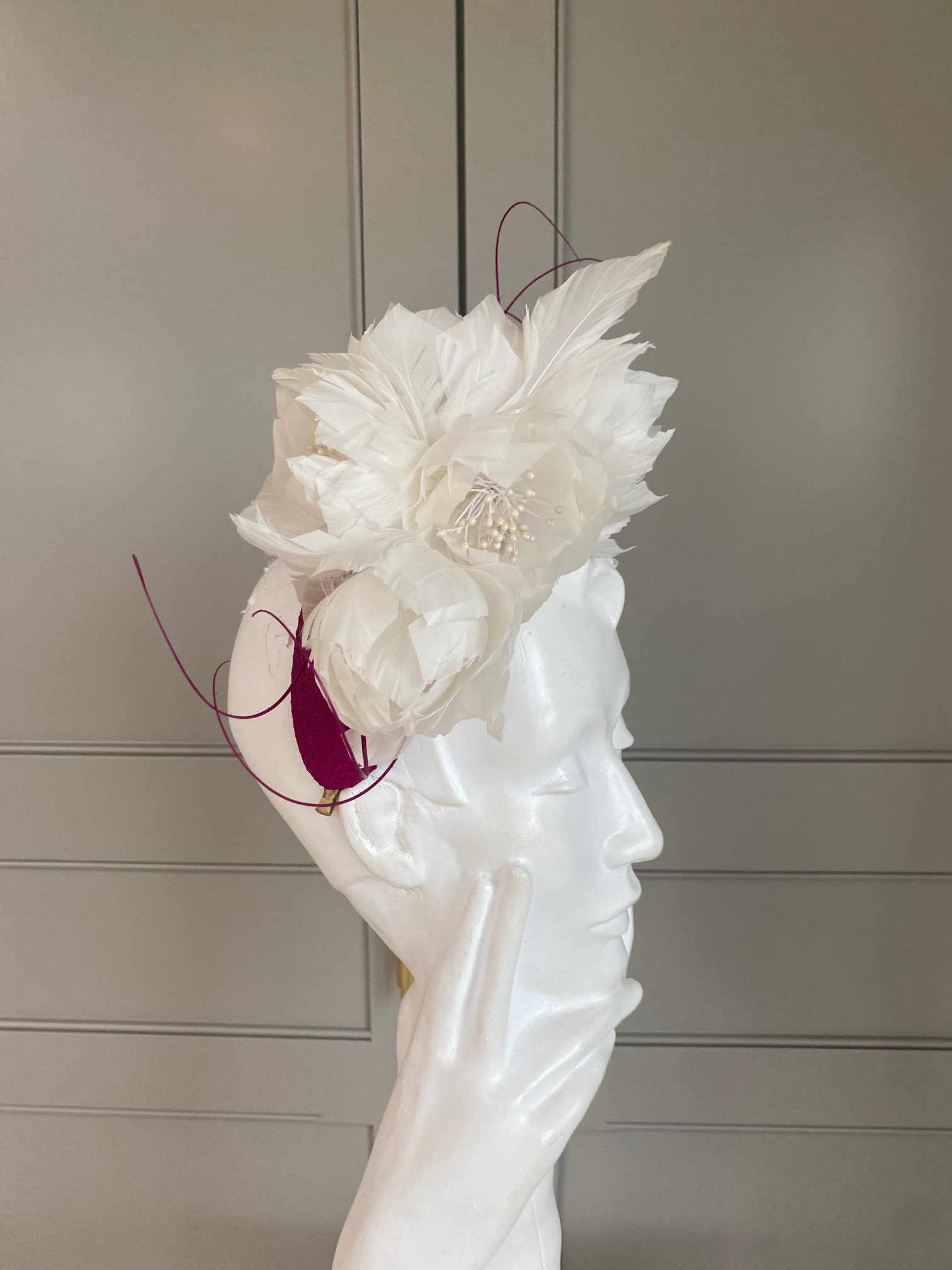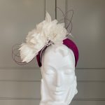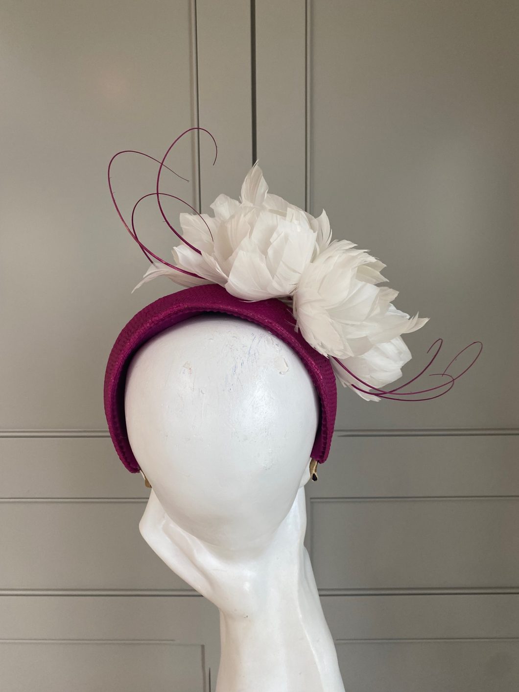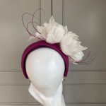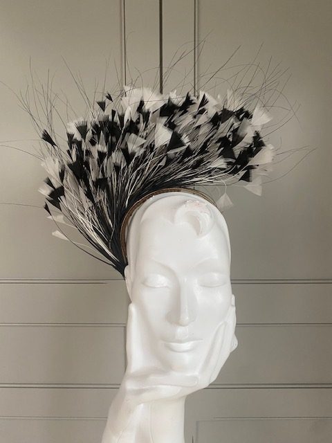A sinamay headband trimmed with small feather flowers and quills