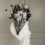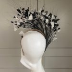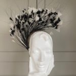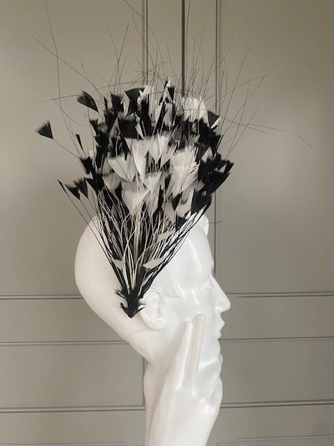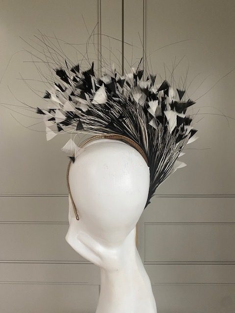 A double wired headband trimmed with black & Ivory feathers