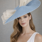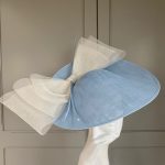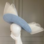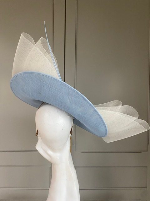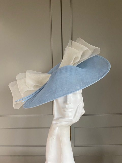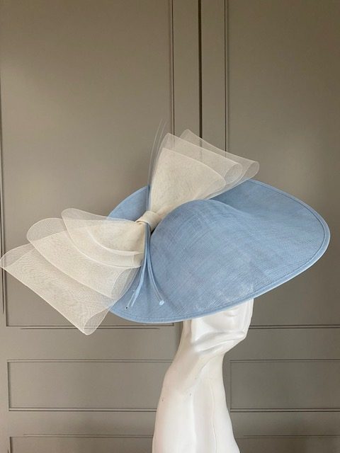 A 18″ sinamay dish , trimmed with a large bow & Quills