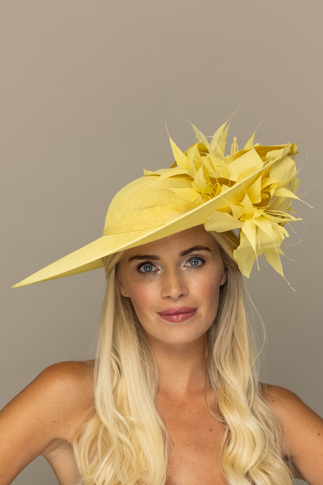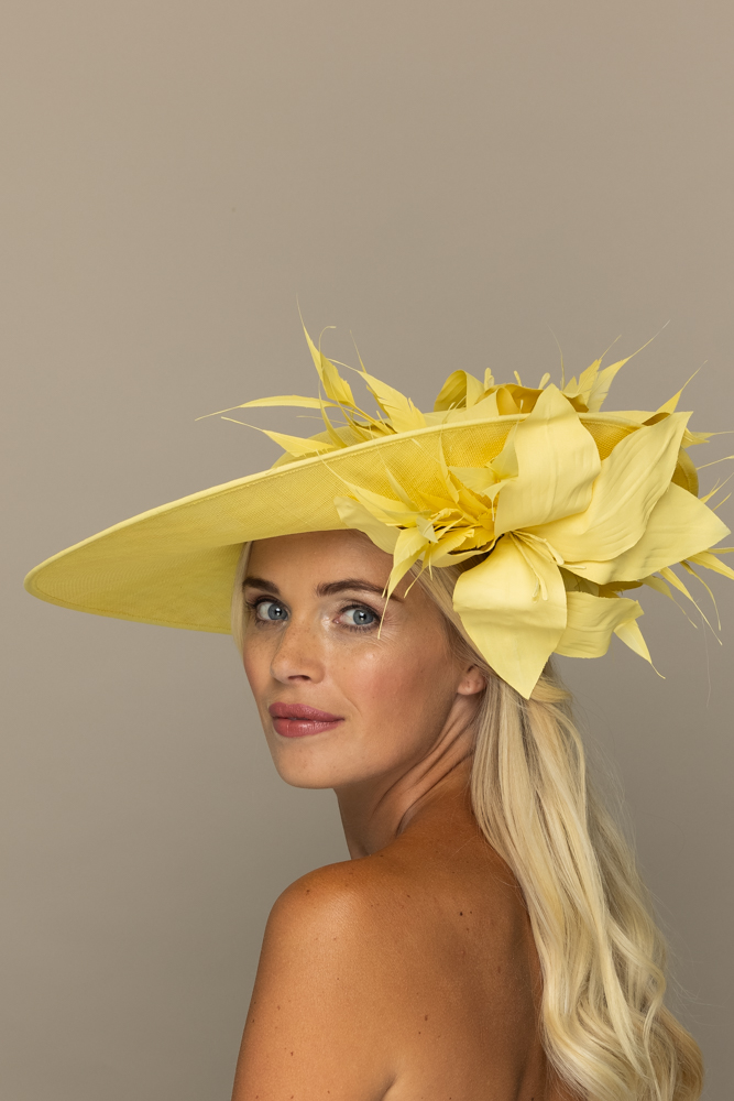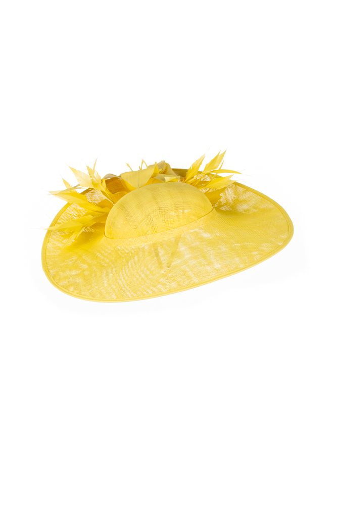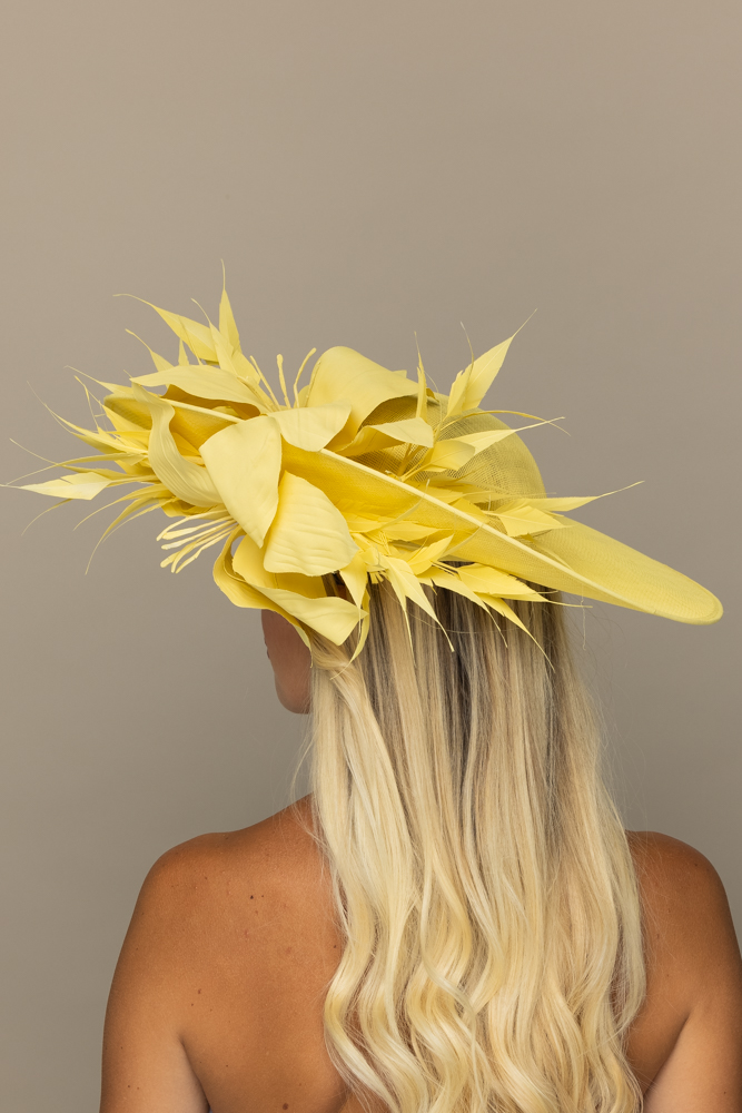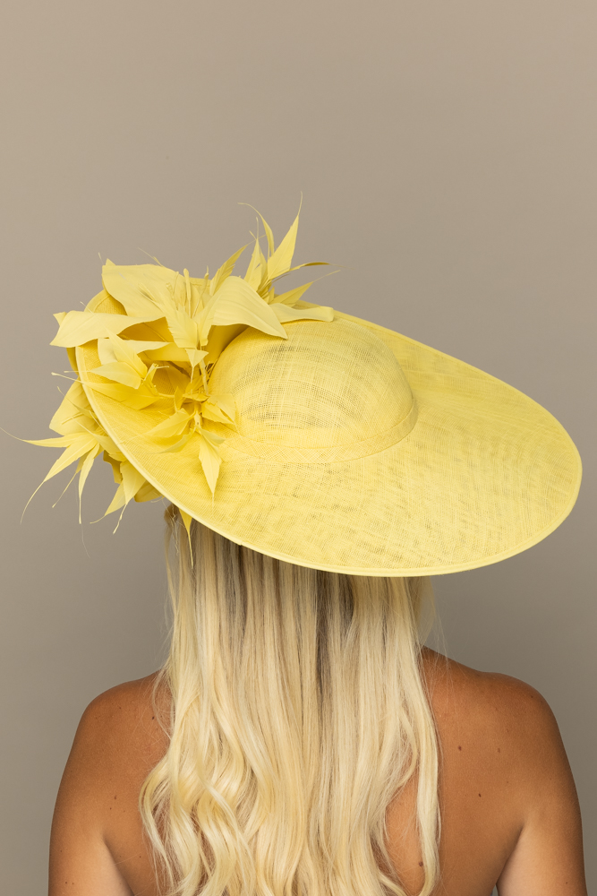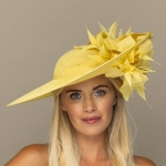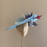 The Sardinia hat comprises a large sinamay dish base in an east to west style, trimmed with a sinamay hat band, spiked feathers and a lily-style flower both above and below the brim. The hat measures 17″ left to right and 16.5″ front to back. The hat comes on a ribbon-wrapped double headband for comfort.
