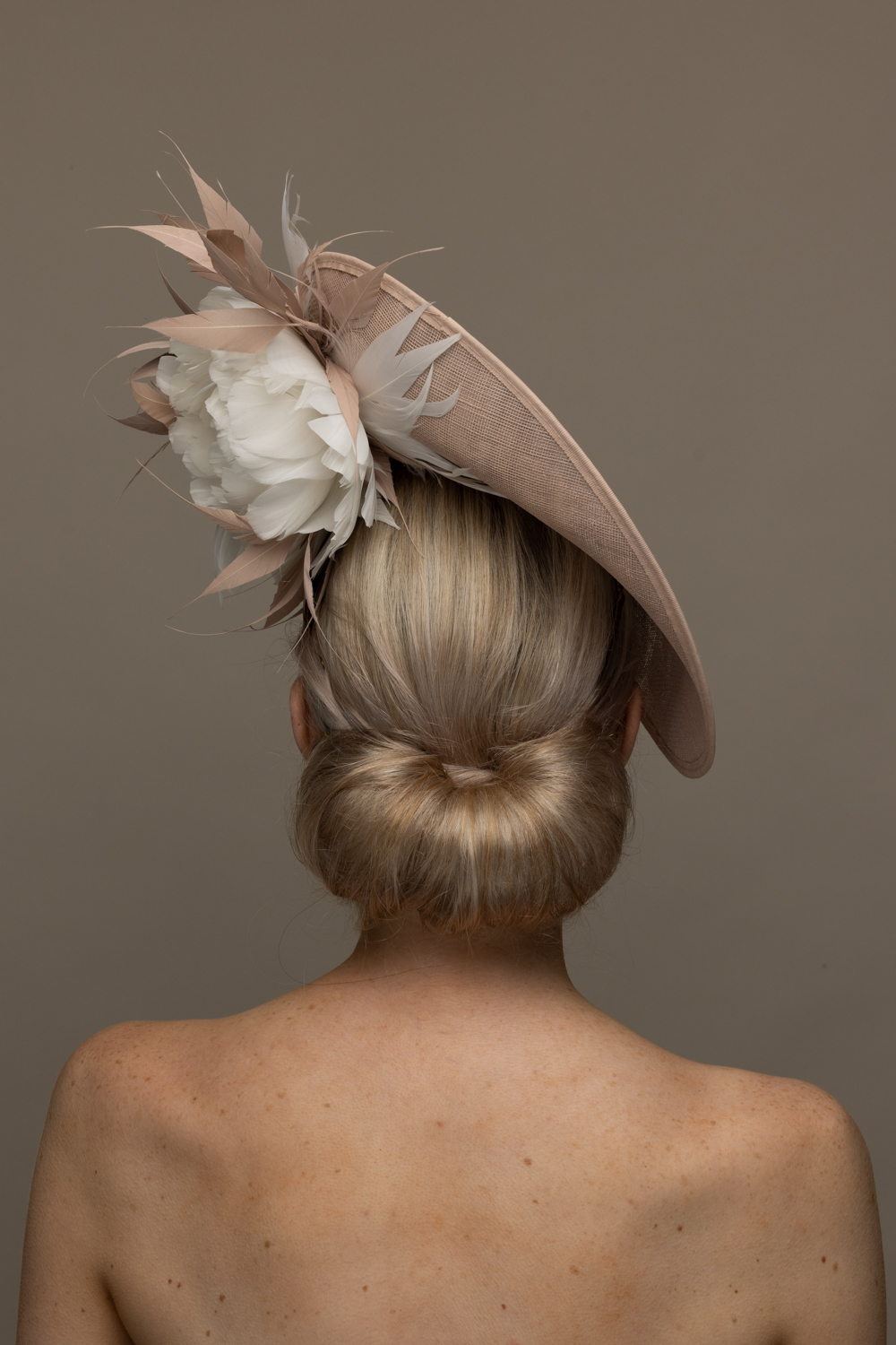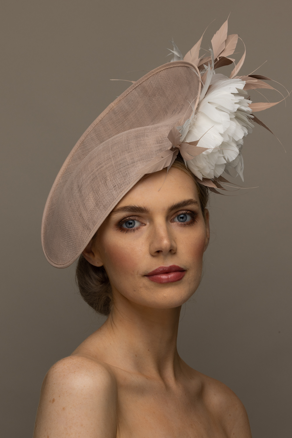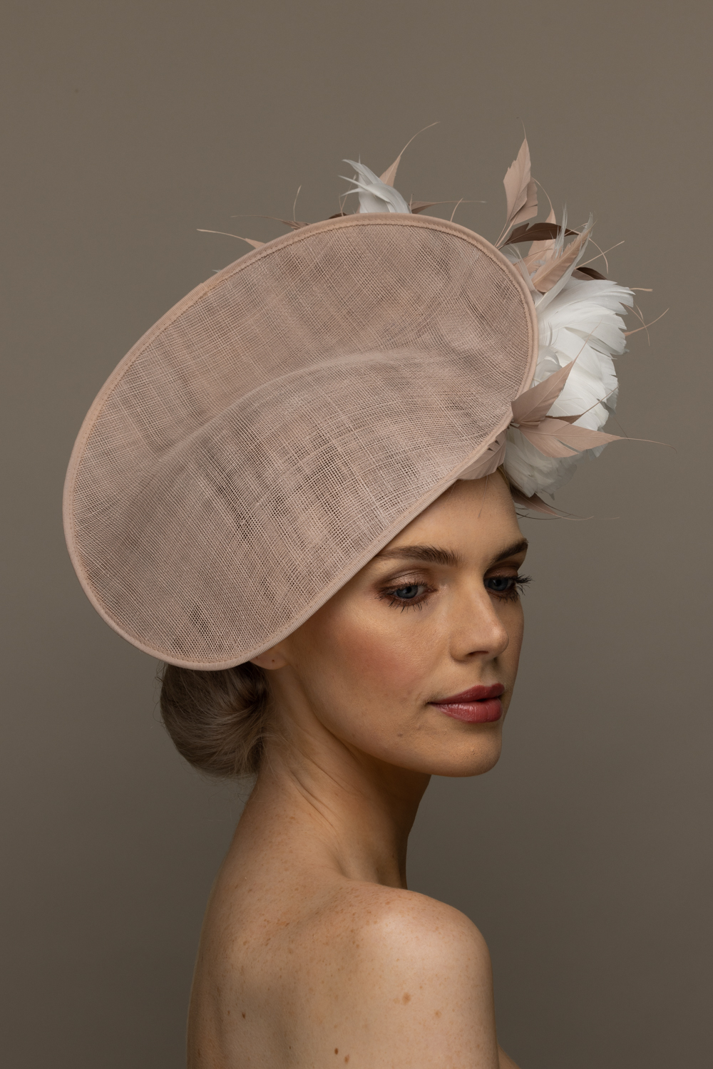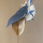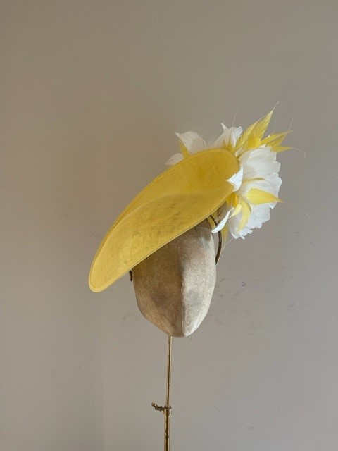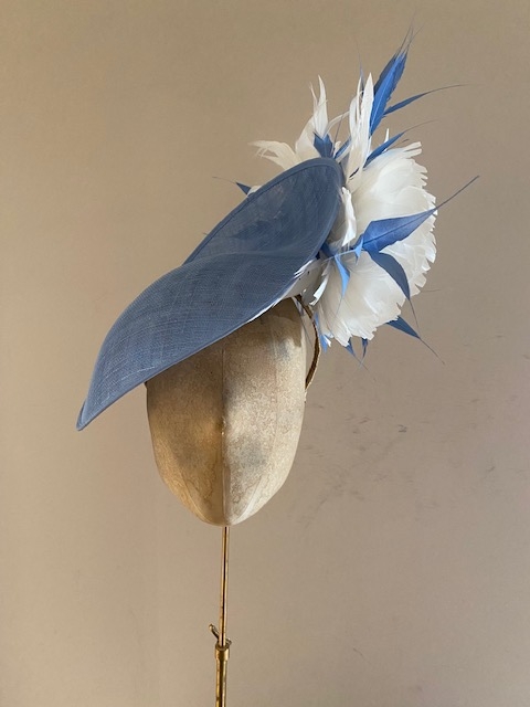 The Shergar Dish hat comprises a sinamay dish base moulded closely to the head on the bottom side. The top of the dish is adorned to the underside with two feather flowers set off with spiked feathers.