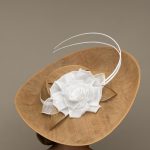 This hat comes on a comfortable, ribbon wrapped double headband which we will match to your hair colour.