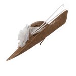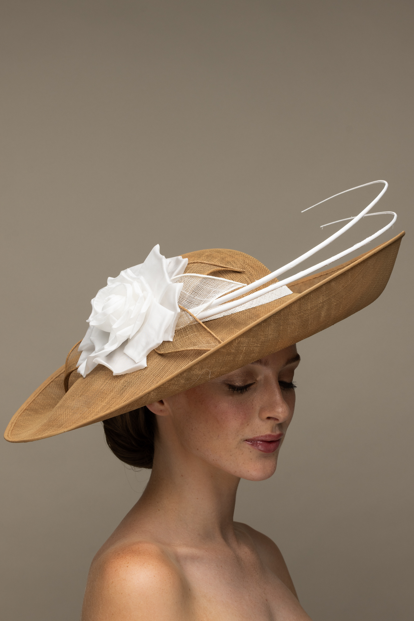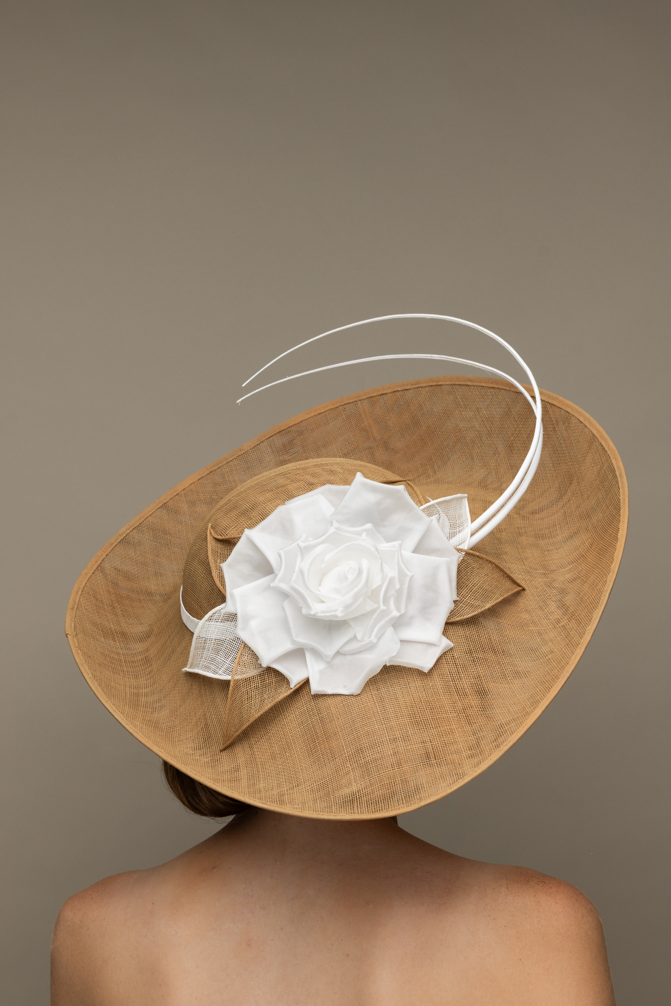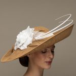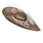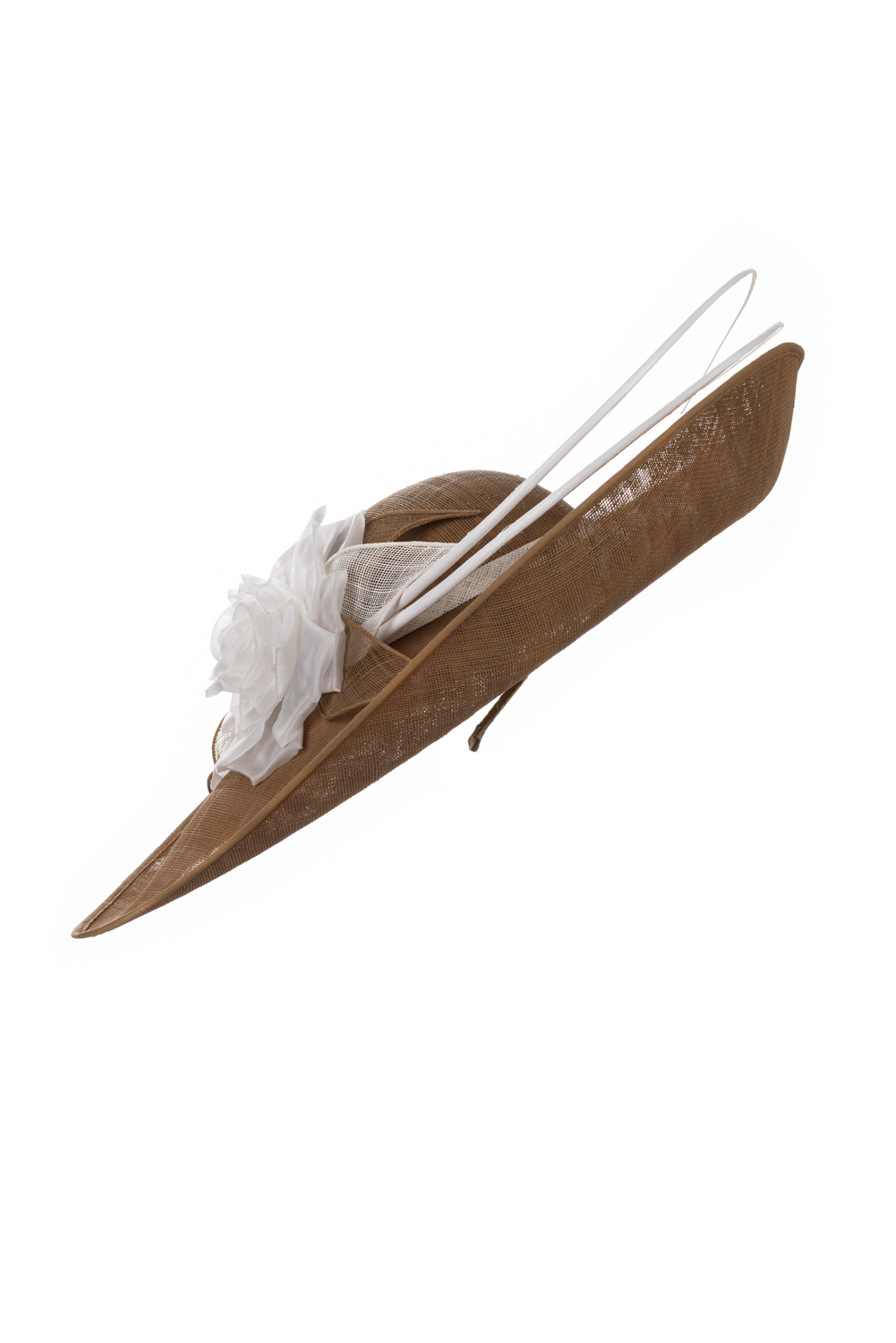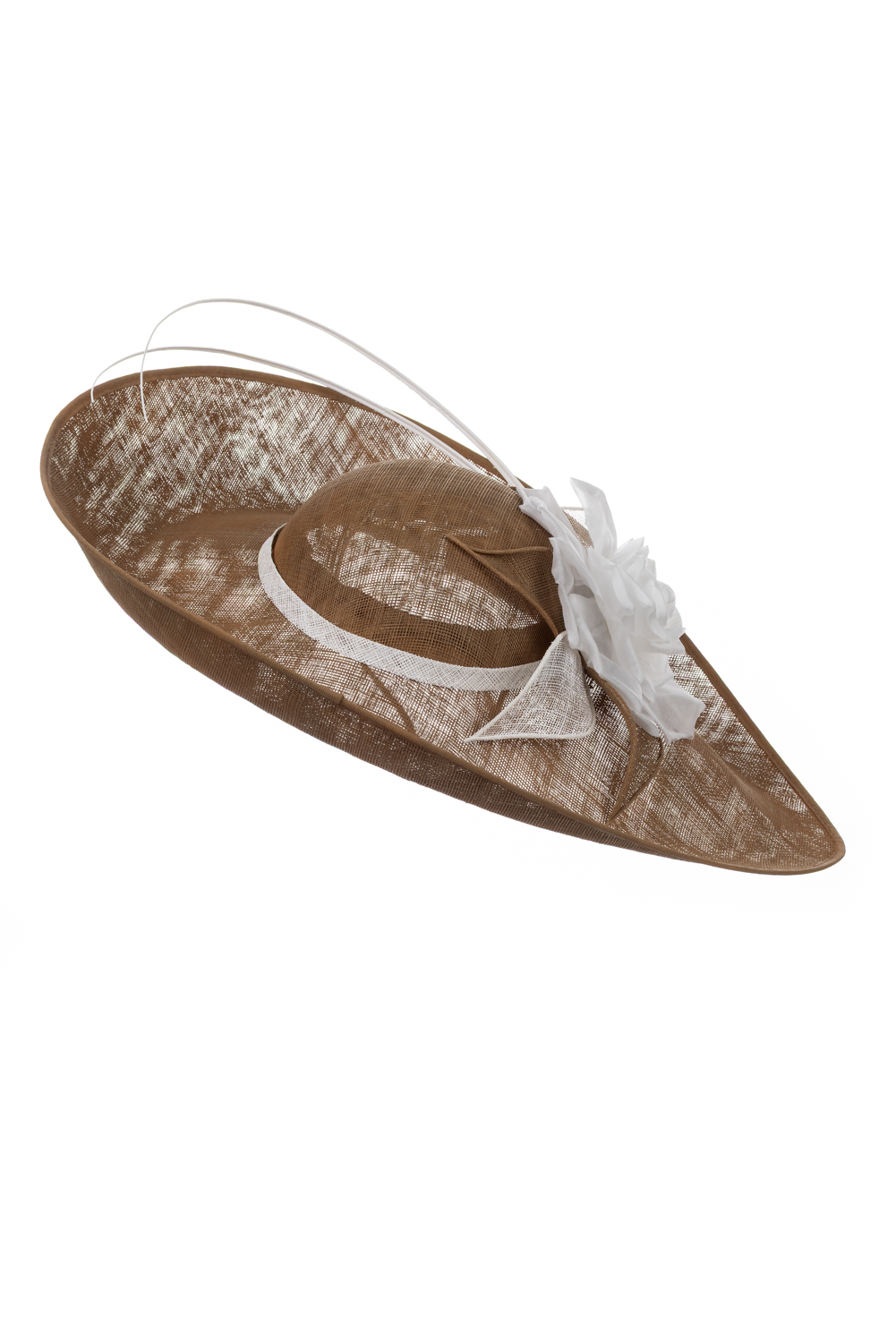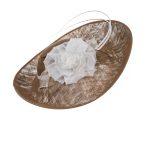 The Sparrow dish hat comprises a sweeping sinamay base with upturn to the front, trimmed with a large rose style flower, sinamay leaves and two elegant curved quills.