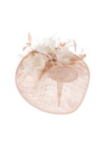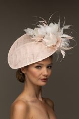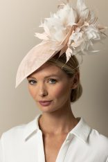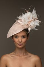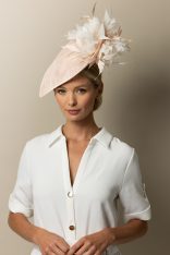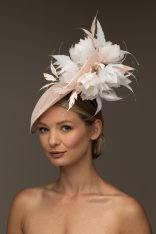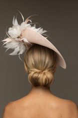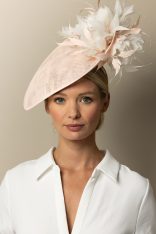 The Stanley Dish hat comprises a sinamay dish base moulded closely to the head. The dish is trimmed either side with feather flowers, interspersed with spiked feathers.