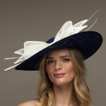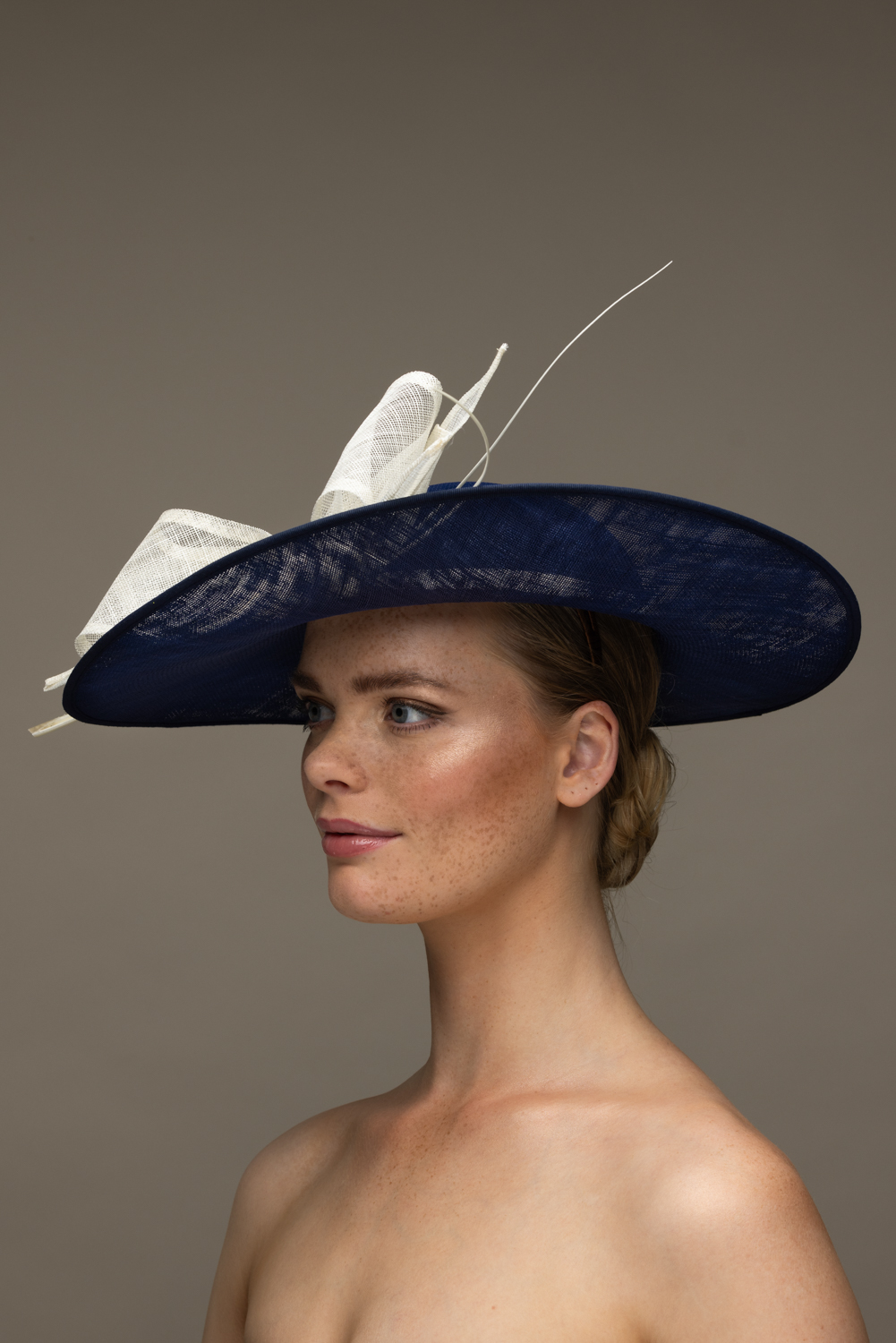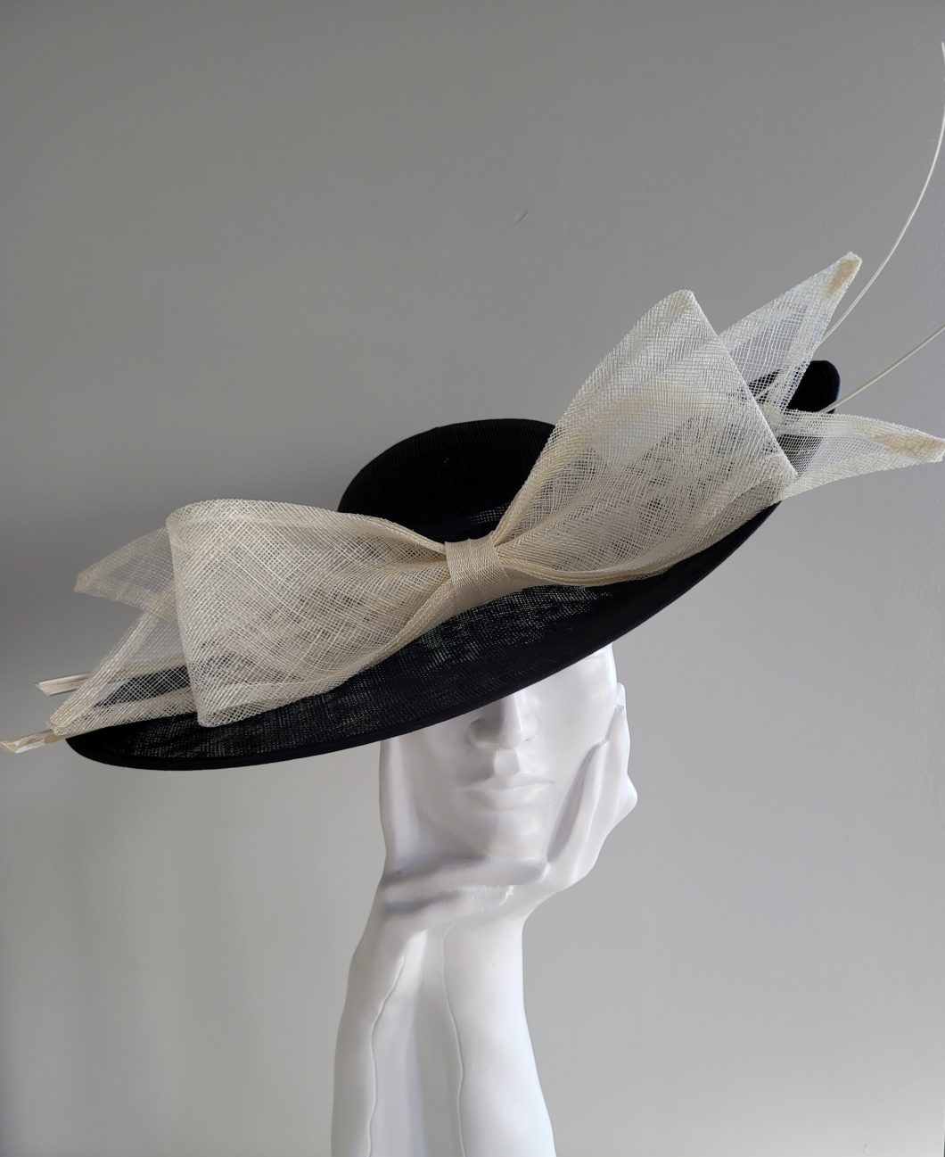 The Sunstone hat comprises a large hat base with shallow crown, trimmed with a narrow sinamay hat band with large sinamay bow to the front, off-set with two elegant quills.