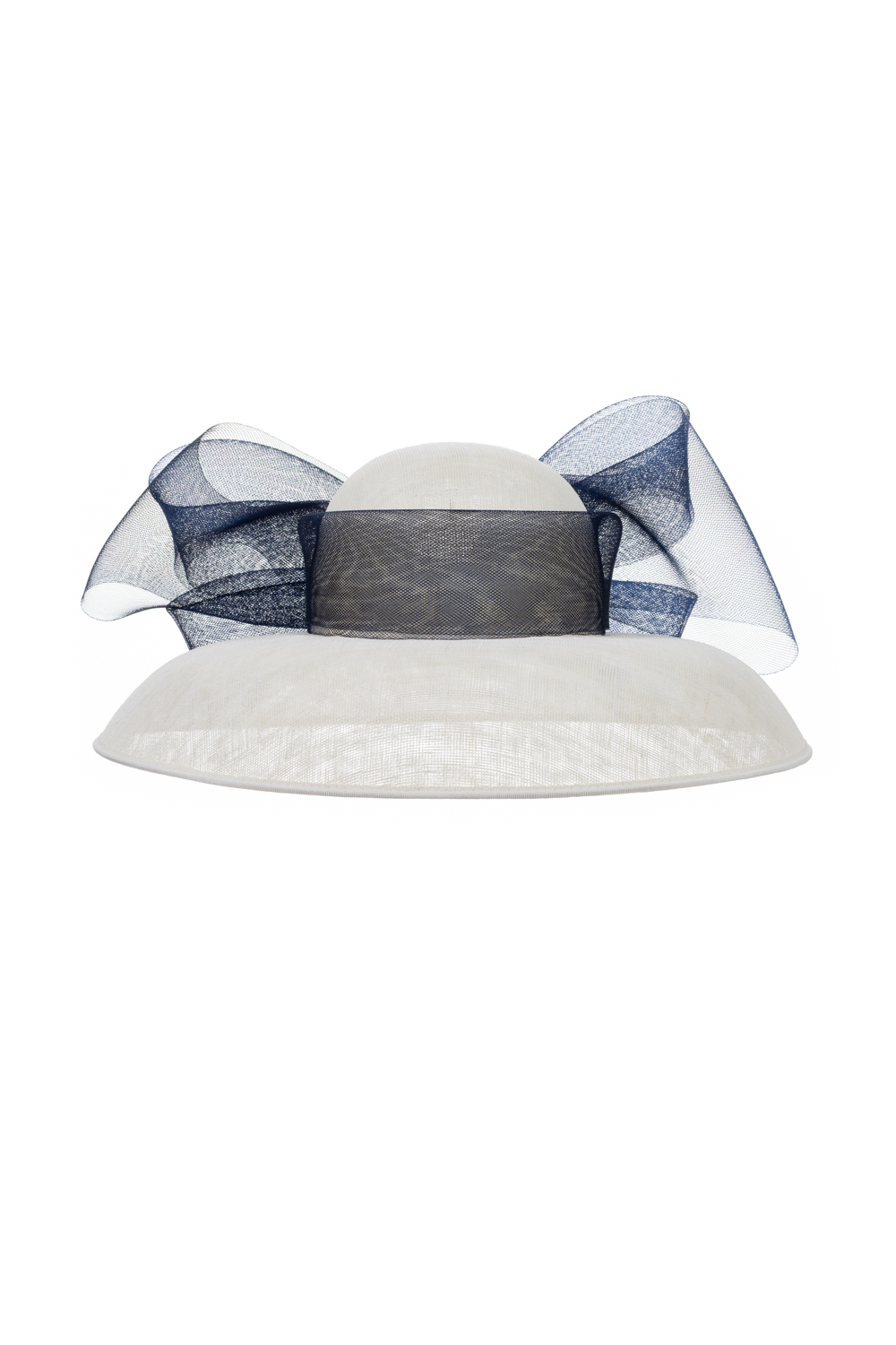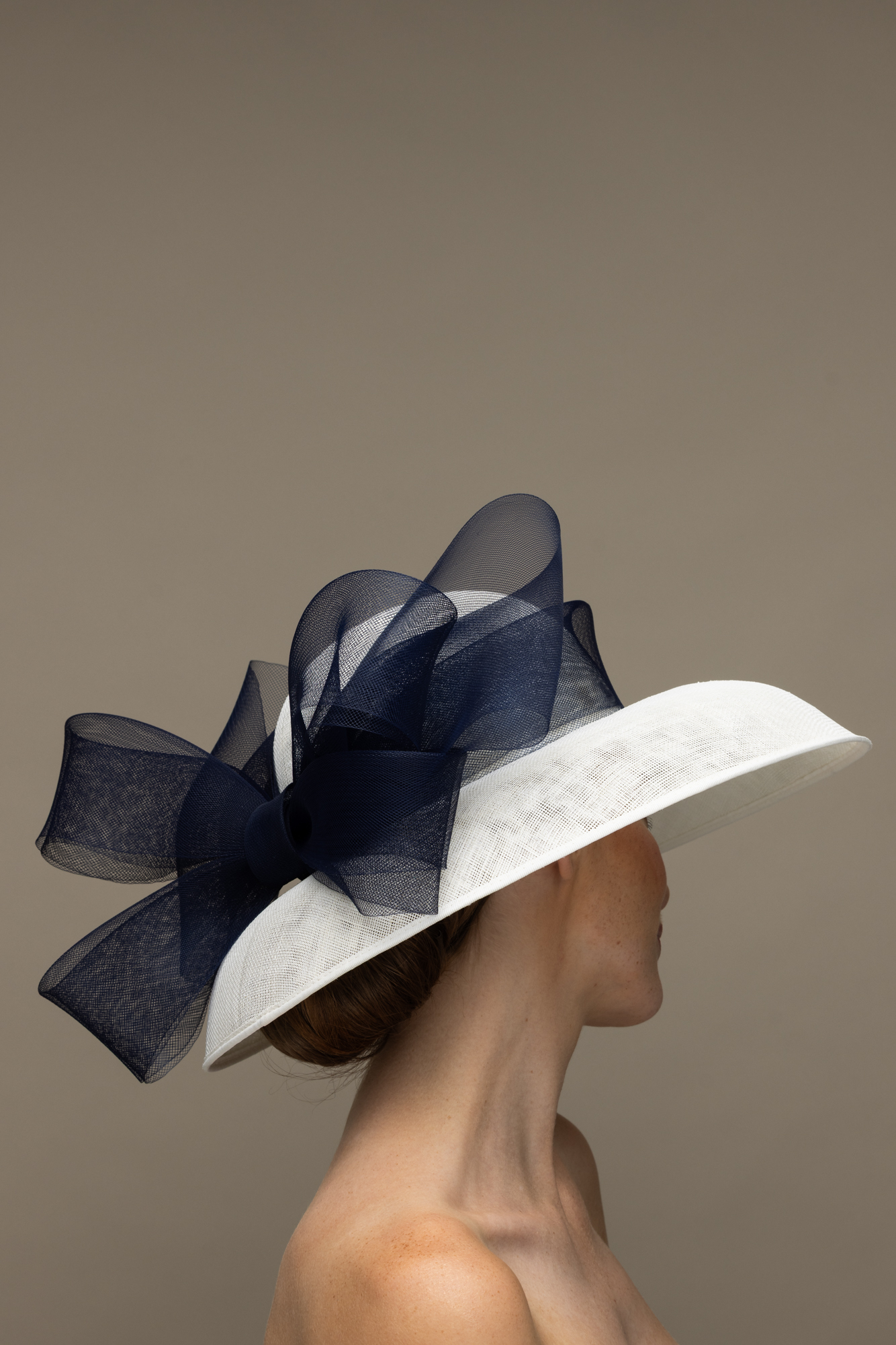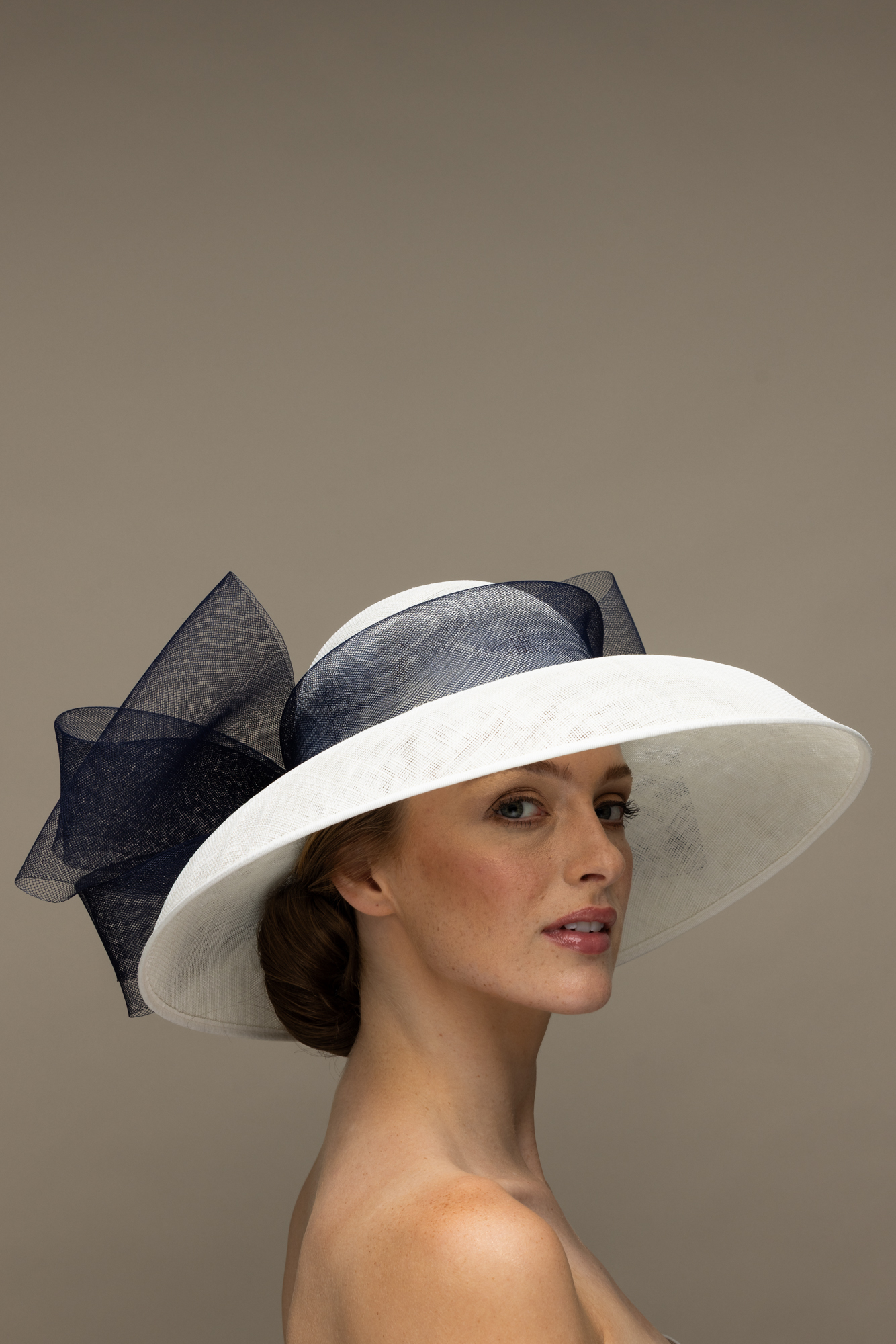 The Swan Hat comprises a sinamay base with a dropped brim trimmed with a deep crinoline band and a signature Hostie bow to the back. The band and bow colour is the same.