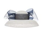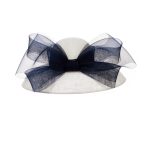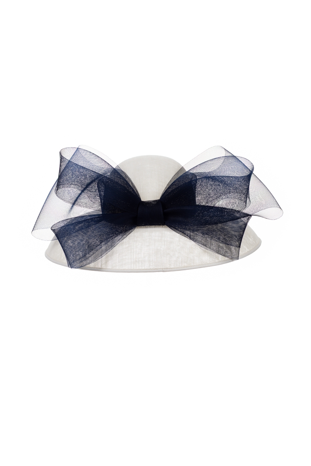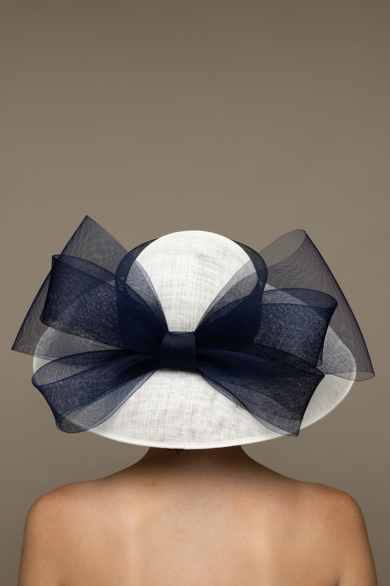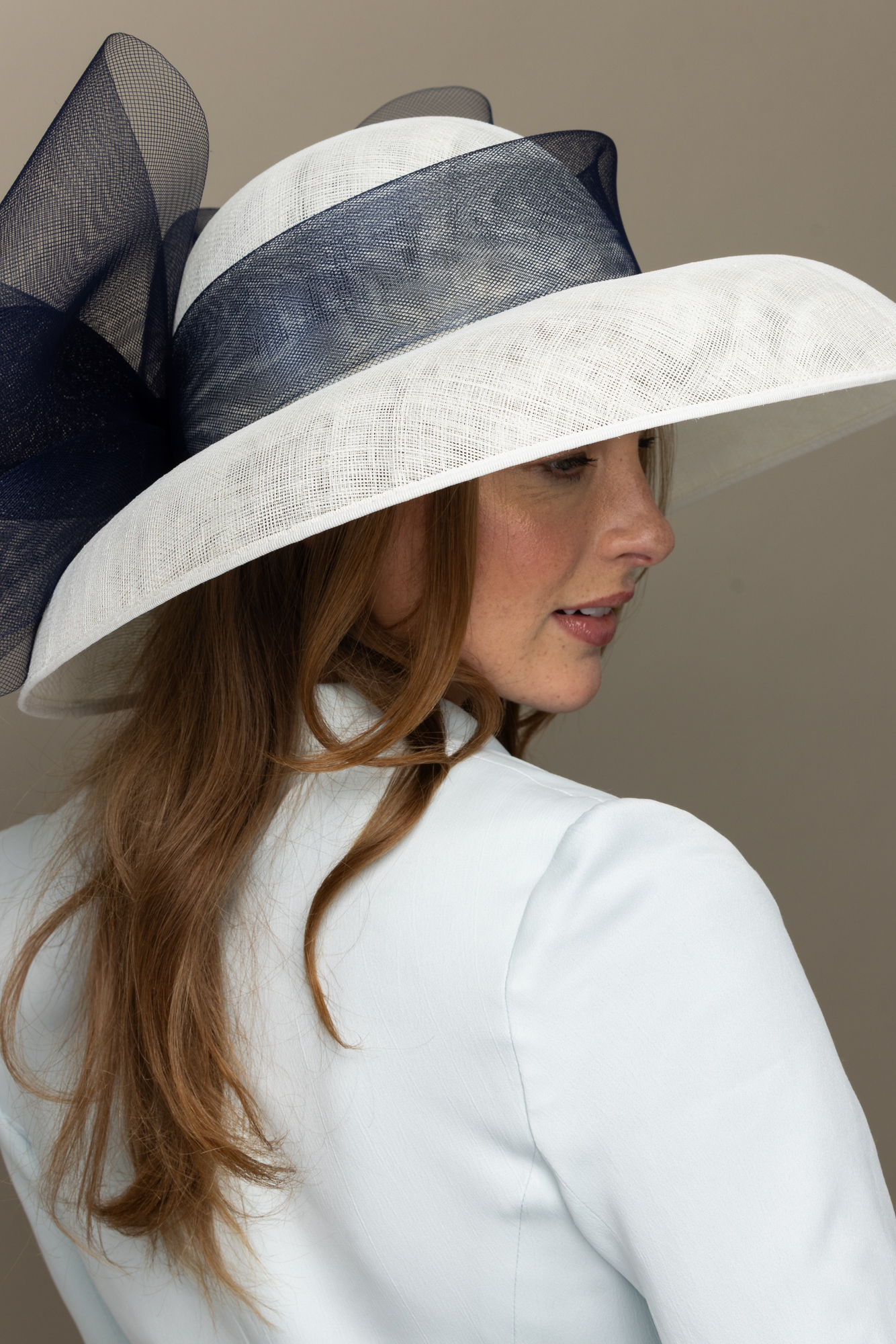 The Swan Hat comprises a sinamay base with a dropped brim trimmed with a deep crinoline band and a signature Hostie bow to the back. The band and bow colour is the same.